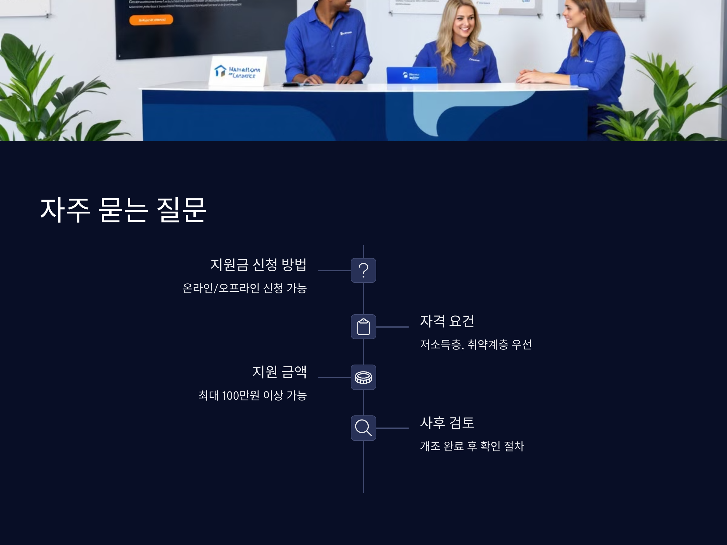 일부 지원 프로그램은 주택 개조 후 검토 절차가 필요합니다. 개조 작업이 완료되면, 관련 기관에서 확인 후 지원금을 지급하게 됩니다. 작업이 규정에 맞게 진행되었는지 점검이 이루어질 수 있습니다.