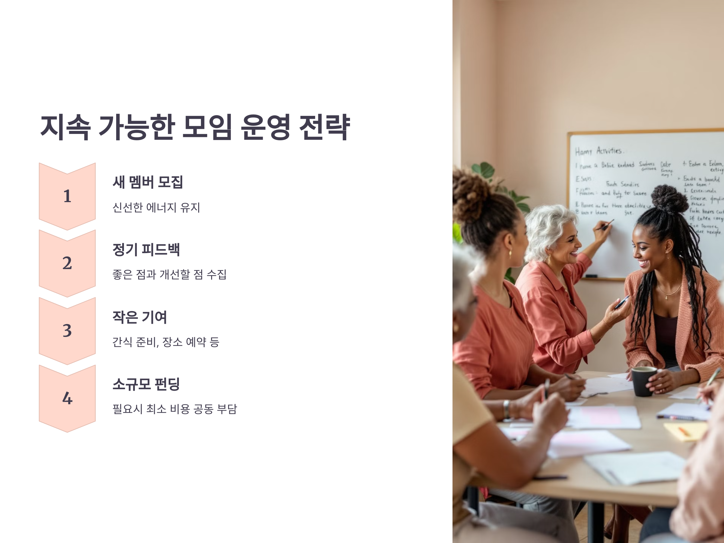 무료 모임이지만 오랫동안 유지하려면 장기적인 운영 전략이 필요합니다. 지속 가능한 모임 운영을 위해 다음을 고려해 보세요.