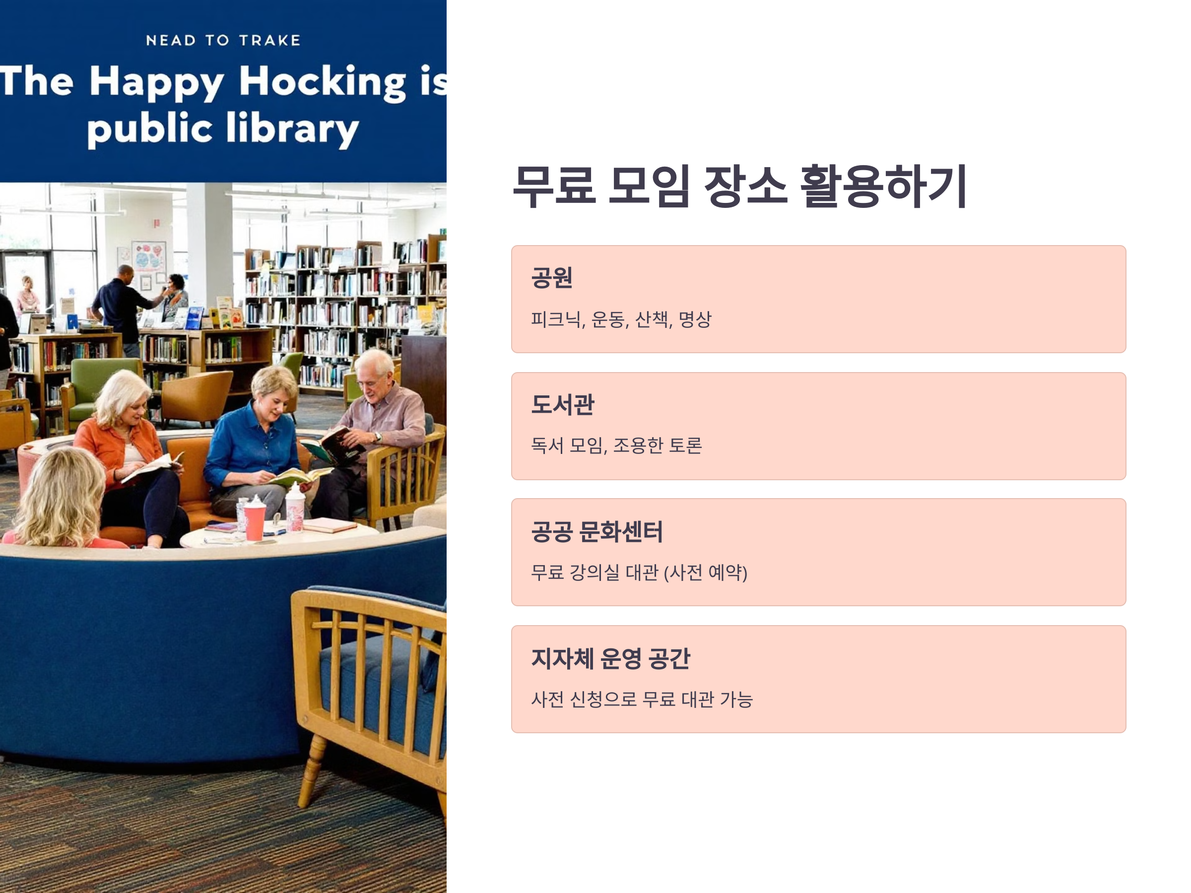 - 도서관: 독서 모임, 조용한 토론, 강의 시청 등 활용 가능