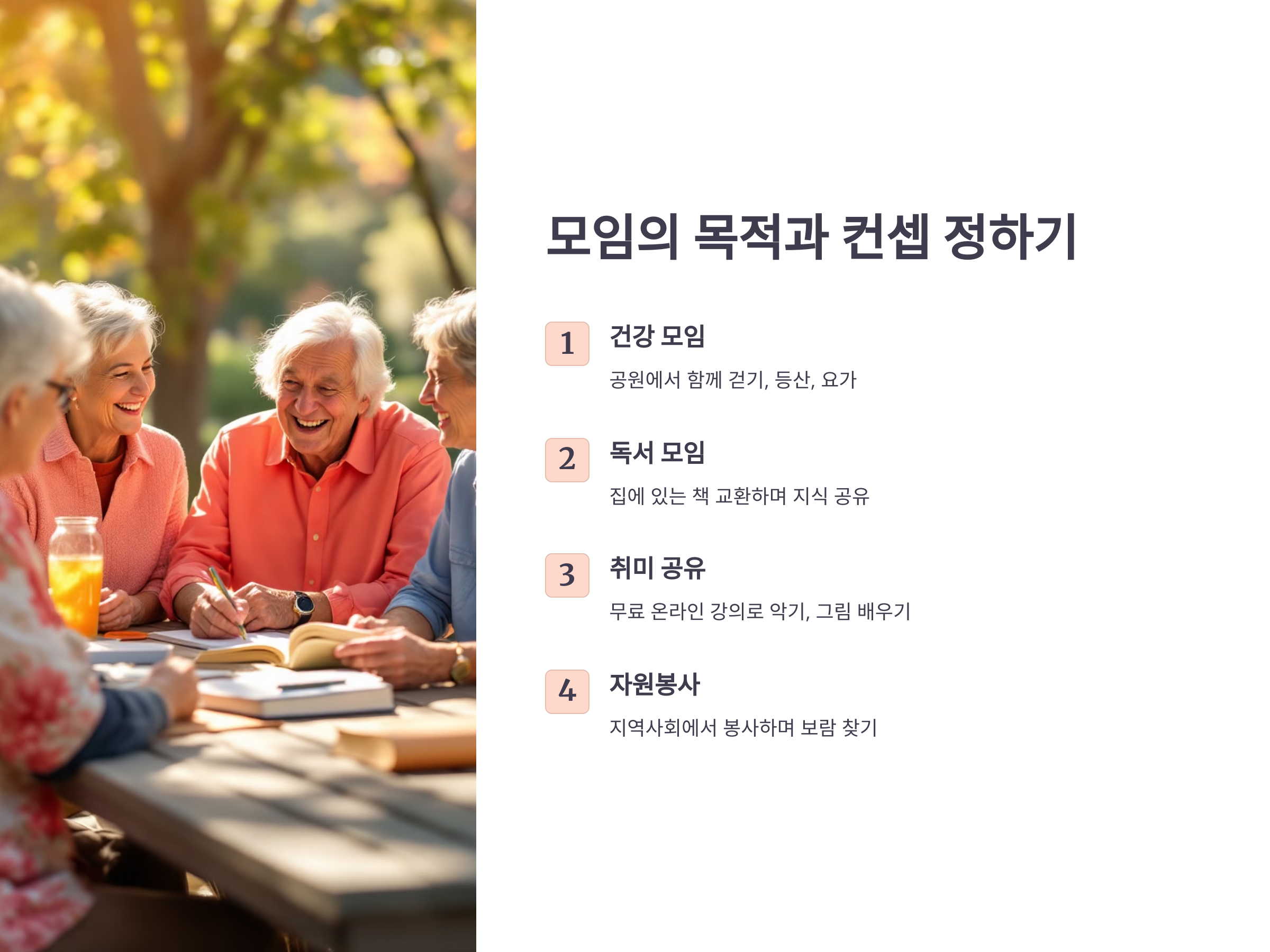 어떤 모임이든 목적이 분명해야 오래 지속됩니다. "무료로 즐긴다"는 점만 강조하면 금방 흥미를 잃을 수 있으니, 모임의 핵심 가치를 정하는 것이 중요합니다. 예를 들어, 다음과 같은 컨셉을 고려해볼 수 있습니다.