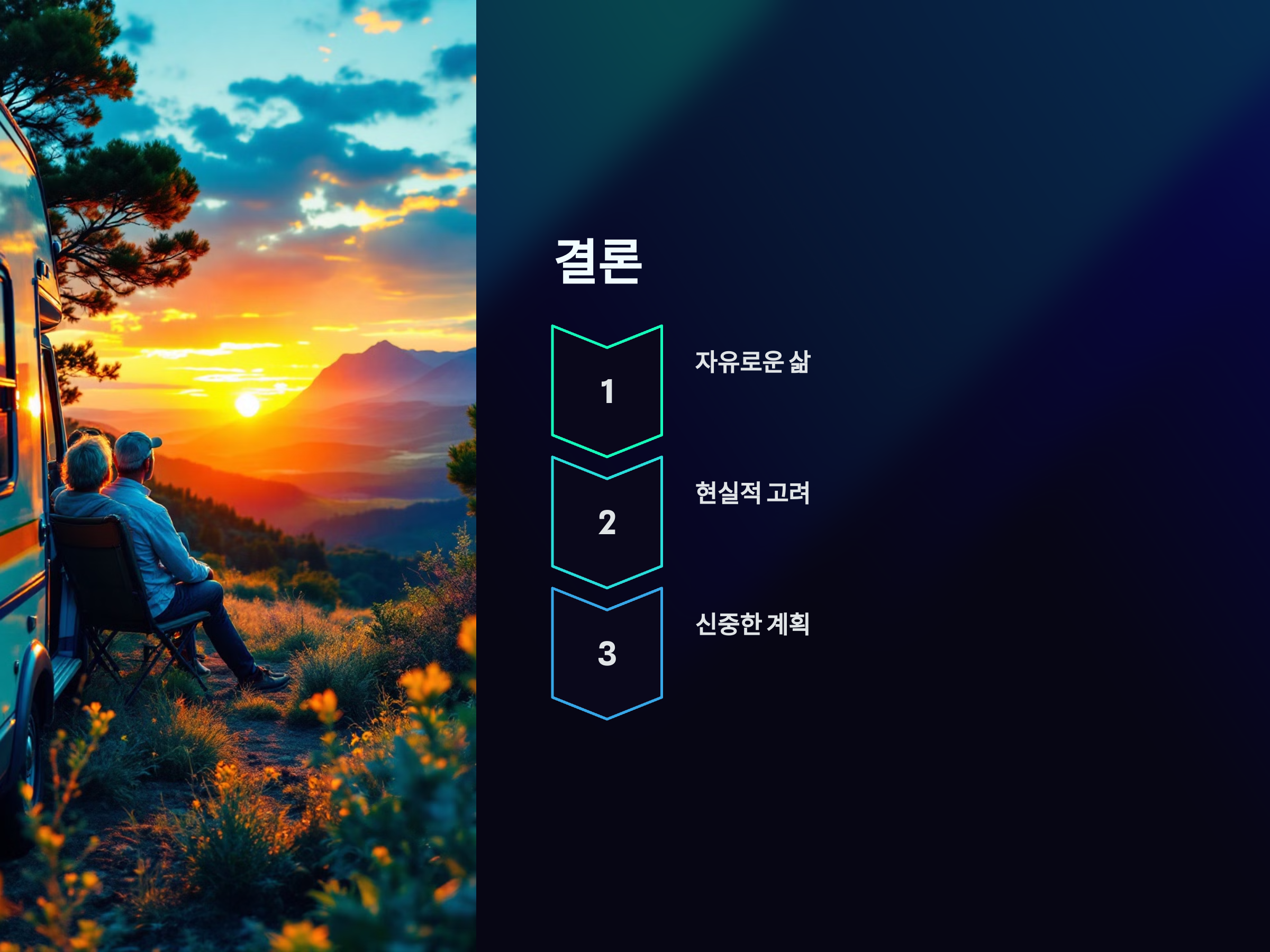 퇴직 후 캠핑카 여행은 자유로운 삶을 누릴 수 있는 훌륭한 방법이지만, 그것만큼 현실적인 고려사항도 많습니다. 초기에 드는 비용, 관리의 부담, 주차 문제 등은 신중하게 검토해야 할 부분입니다. 하지만 자유롭게 여행하며 자연을 만끽하고 싶다면 캠핑카 여행은 분명히 매력적인 선택이 될 수 있습니다. 본인의 라이프스타일과 여행 스타일에 맞춰 잘 계획하고 준비한다면, 퇴직 후의 삶을 더 풍요롭게 만들어줄 수 있는 멋진 여행이 될 것입니다.
