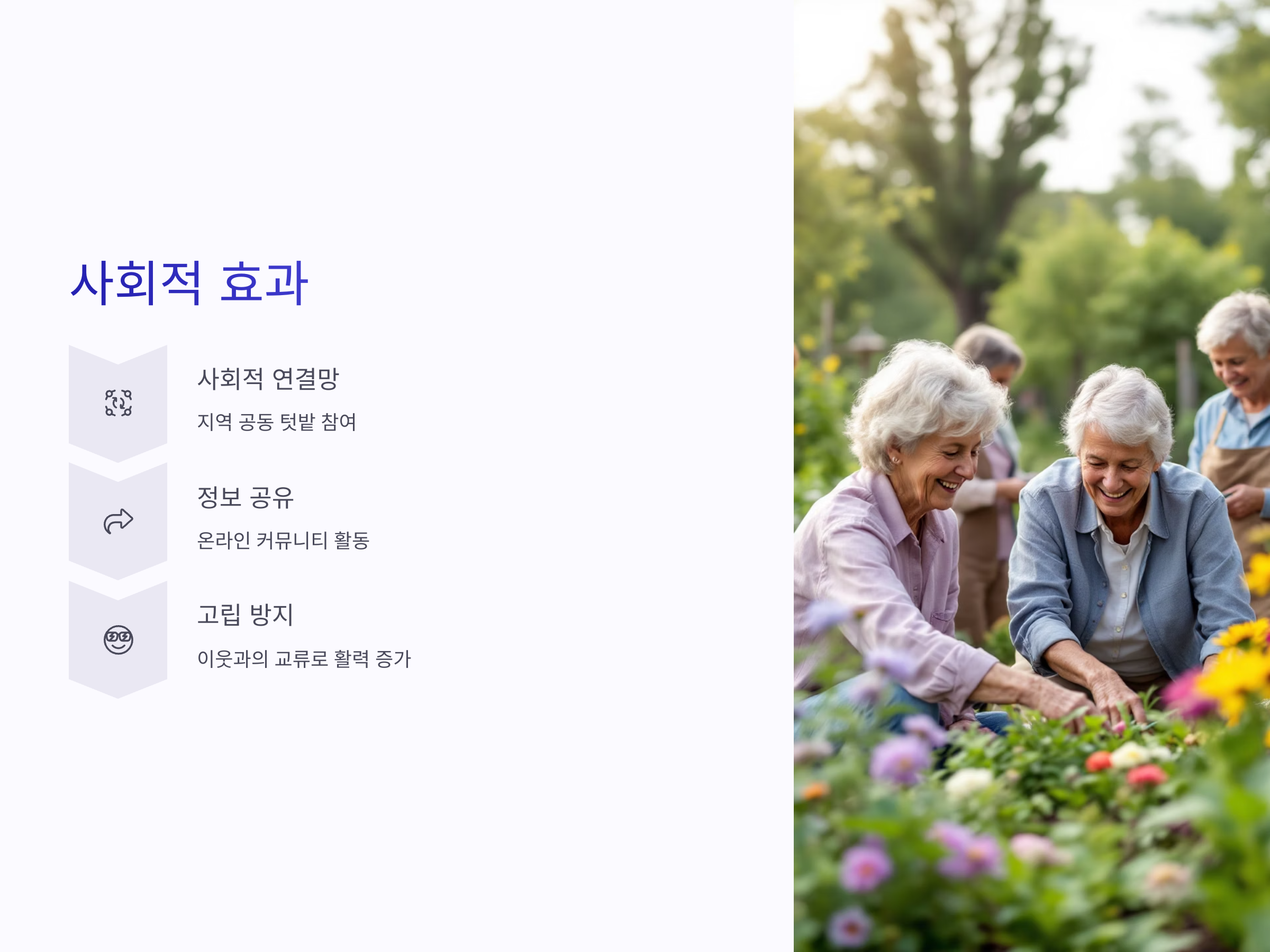 텃밭을 함께 가꾸는 이웃들과의 교류는 사회적 지원을 받을 수 있는 중요한 기회를 제공합니다. 이렇게 얻은 새로운 인간 관계는 퇴직 후 지루하고 고립된 생활을 예방하고, 삶에 활력을 불어넣는 중요한 요소가 됩니다.