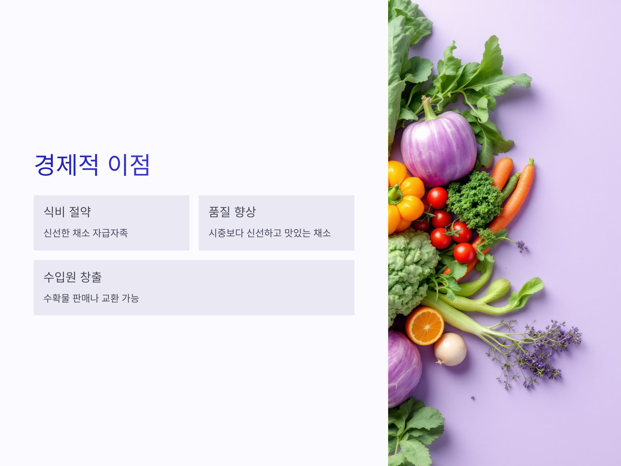 텃밭을 가꾸는 것은 또한 경제적으로 유익할 수 있습니다. 매일 신선한 채소를 직접 기를 수 있기 때문에 식비 절약이 가능합니다. 일반적으로 시중에서 판매되는 채소보다 훨씬 더 신선하고 맛있는 채소를 자급자족할 수 있기 때문에, 장기적으로 보면 가계 경제에도 긍정적인 영향을 미칩니다.