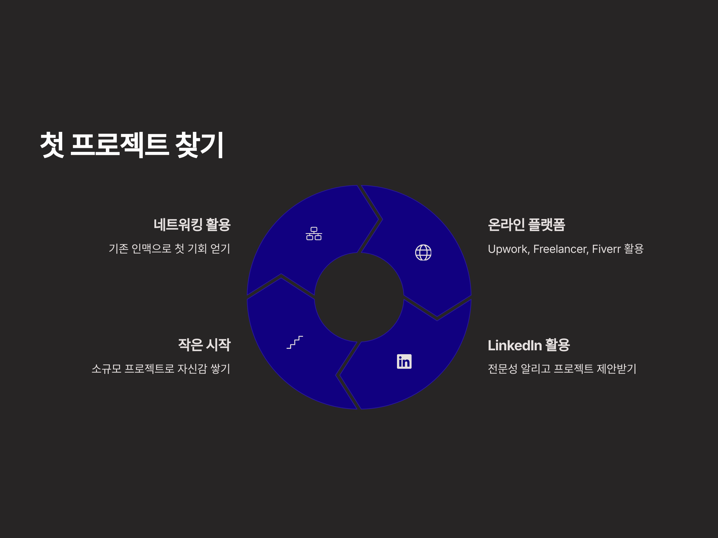 또한 기존의 네트워크를 활용하는 것도 좋은 방법입니다. 퇴직 전에 쌓아온 인맥을 통해 첫 번째 프로젝트를 시작하는 경우가 많습니다. LinkedIn 같은 직장인 네트워크 플랫폼에서 자신의 전문성을 알리고, 관련된 프로젝트를 제안받을 수 있습니다. 처음에는 작은 프로젝트부터 시작해 점차 자신감을 얻고, 더 큰 프로젝트를 맡을 수 있는 능력을 기르는 것이 중요합니다.