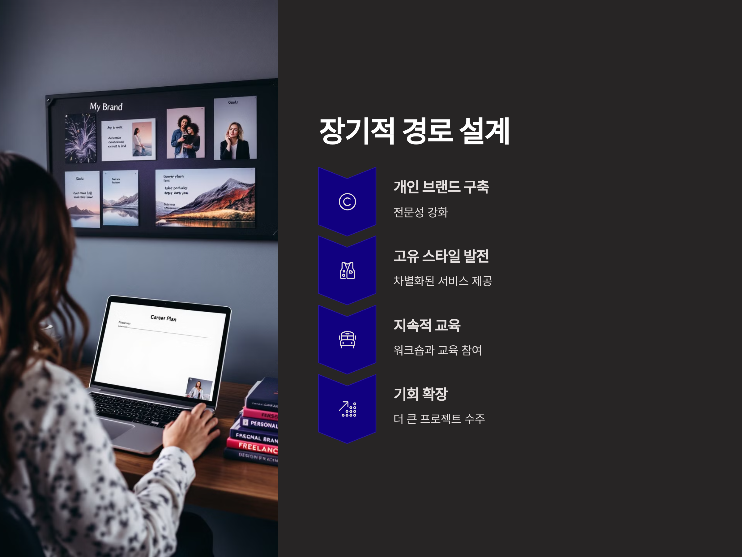 프리랜서로 일을 하면서 자신만의 고유한 스타일을 발전시키고, 이를 시장에 맞게 홍보하는 과정이 필요합니다. 또한, 정기적인 교육이나 워크숍 참여를 통해 지속적으로 발전하는 모습을 보여주는 것도 중요합니다. 퇴직 후 프리랜서로서의 경로는 점차 더 많은 기회를 창출할 수 있는 방향으로 발전할 수 있습니다.