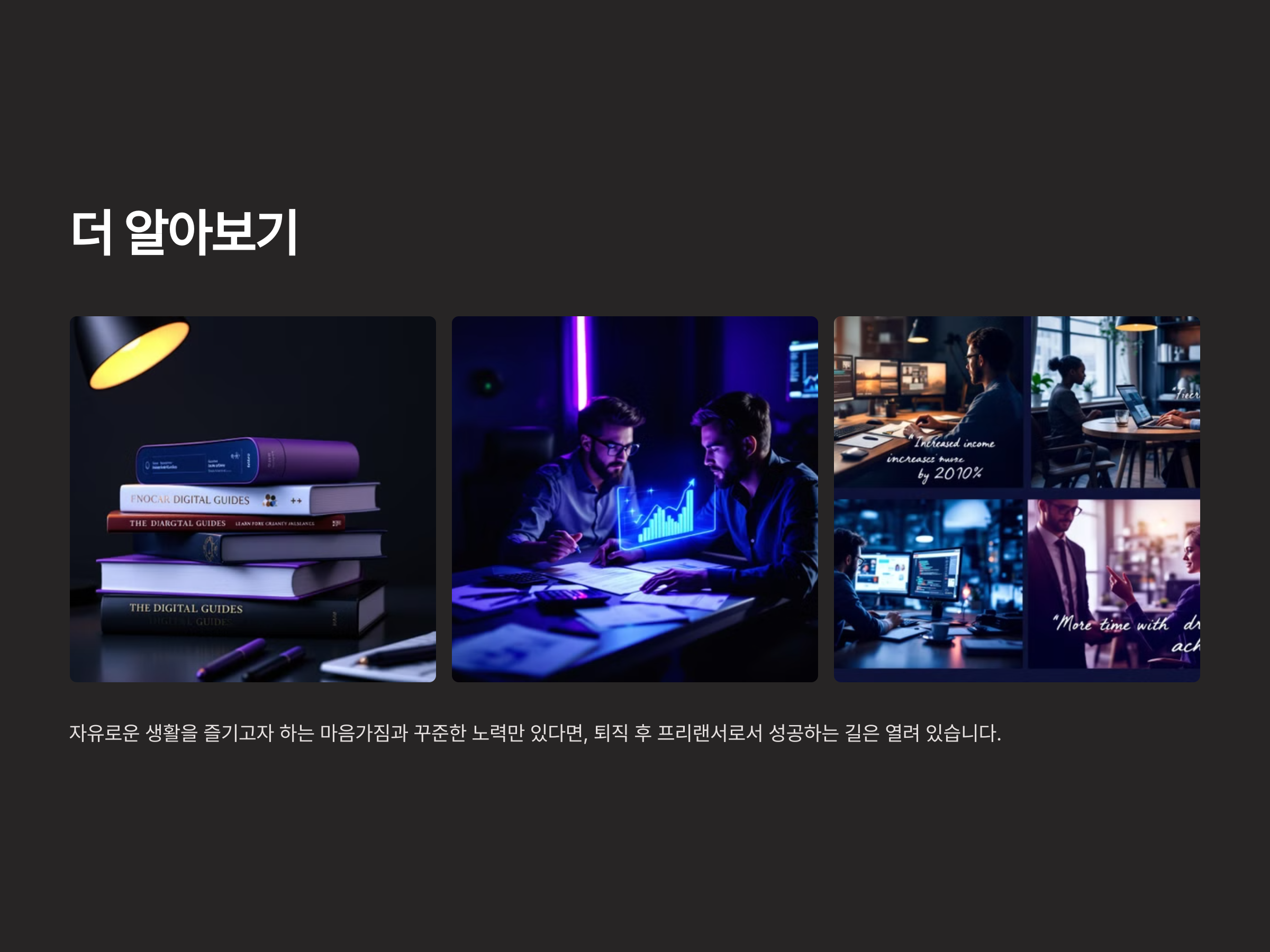 프리랜서로서 일하는 것은 단순한 직업을 넘어서, 자신의 인생을 재설계하는 과정이기도 합니다. 꾸준한 자기 개발과 시장의 흐름에 맞춰 나아간다면, 퇴직 후에도 만족스러운 경력을 이어갈 수 있을 것입니다. 무엇보다, 자유로운 생활을 즐기고자 하는 마음가짐과 꾸준한 노력만 있다면, 퇴직 후 프리랜서로서 성공하는 길은 열려 있습니다.