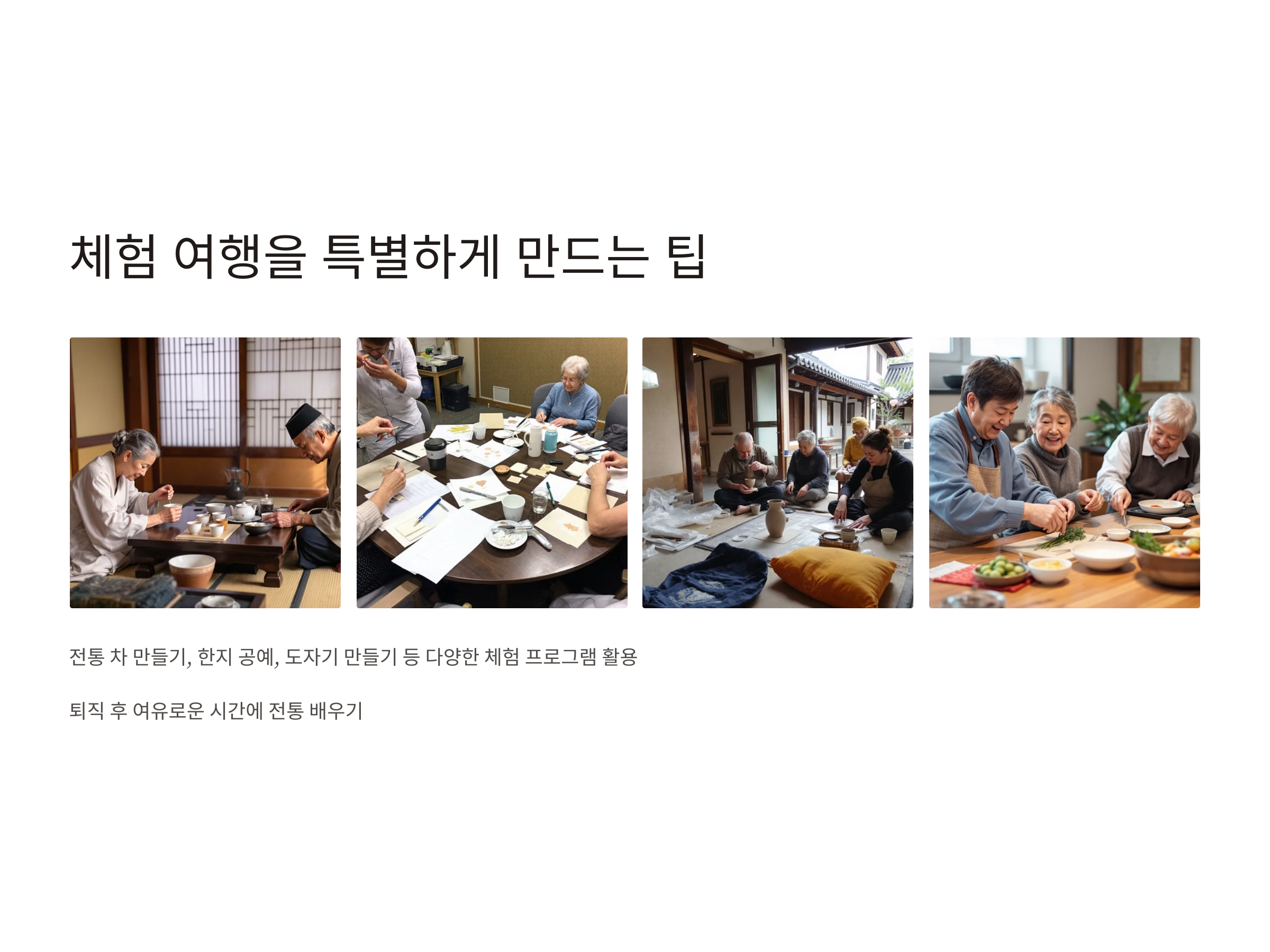 한옥 숙박지에서는 전통 차 만들기, 한지 공예, 도자기 만들기 등 다양한 체험을 제공하는 곳이 많습니다. 퇴직 후 여유로운 시간을 보내며 전통을 배우고, 손으로 만든 작품을 기억으로 남길 수 있는 좋은 기회입니다. 특히 한지 공예는 한국의 전통 종이 문화를 배우는 재미와 보람을 함께 느낄 수 있는 프로그램입니다.