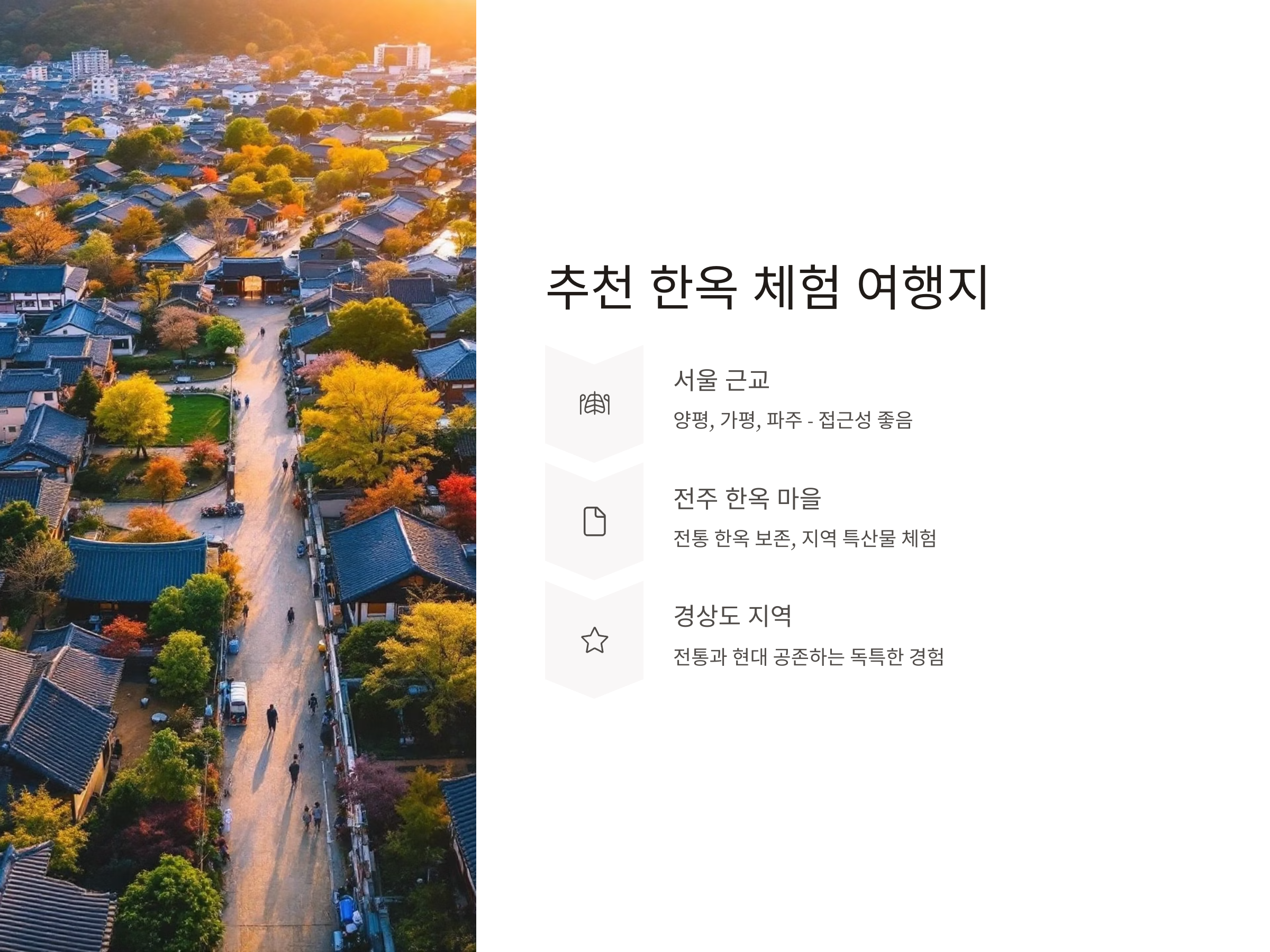 서울 근교에서는 전통적인 한옥을 체험할 수 있는 숙박지가 많습니다. 특히 양평, 가평, 파주 등지에서는 자연 속에서 한옥 체험을 하면서도 서울에서의 접근성이 좋습니다. 한옥 마을에서 숙박을 하며, 서울의 명소들도 함께 둘러볼 수 있어 퇴직 후 여행 계획을 세울 때 매우 유용합니다.