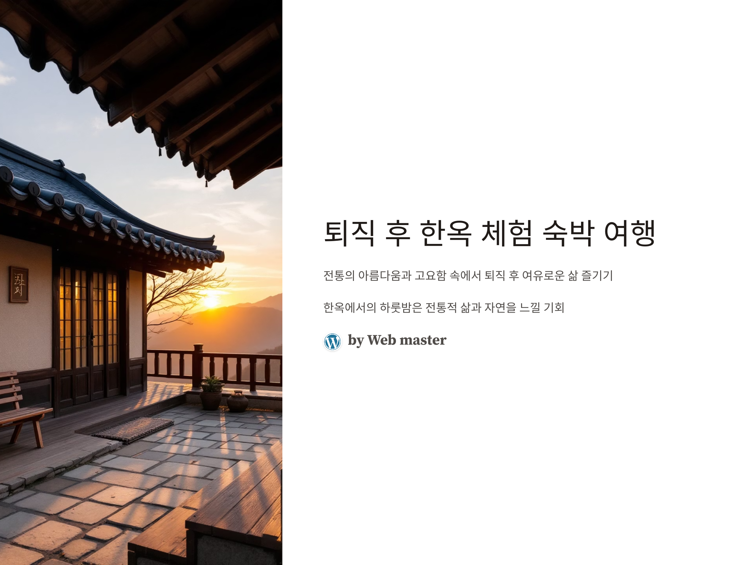 퇴직 후 삶을 여유롭게 즐기기 위한 방법으로 한옥 체험 숙박 여행은 그 자체로 훌륭한 선택이 될 수 있습니다. 전통적인 분위기 속에서 자연과 전통을 체험하며, 퇴직 후의 삶을 더욱 풍요롭고 행복하게 만들어줄 것입니다. 한옥에서의 체험은 단순한 여행이 아니라, 삶의 여유를 느끼고, 스스로를 돌보는 중요한 시간이 될 것입니다.