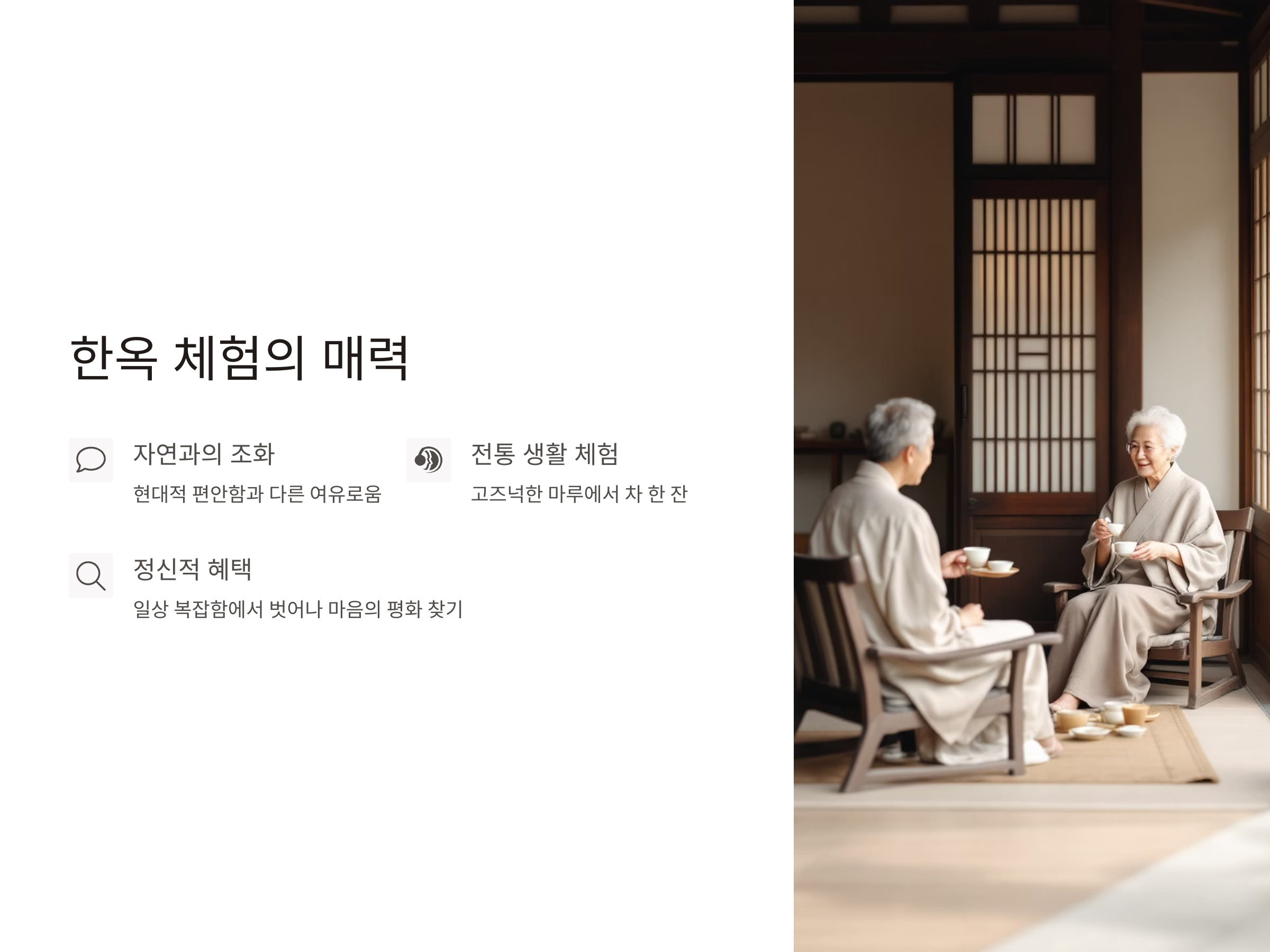 한옥에서의 체험은 단순한 숙박 이상의 가치를 제공합니다. 전통적인 생활방식은 일상의 복잡함에서 벗어나, 마음의 평화를 찾게 해줍니다. 마루에서의 명상, 대청마루에서의 차 한 잔, 자연과 하나 되는 순간들은 퇴직 후 삶의 여유를 느끼기에 완벽합니다. 자연과의 조화를 중요시하는 한옥은 스트레스를 줄이고 정신적으로 안정감을 느끼게 합니다.