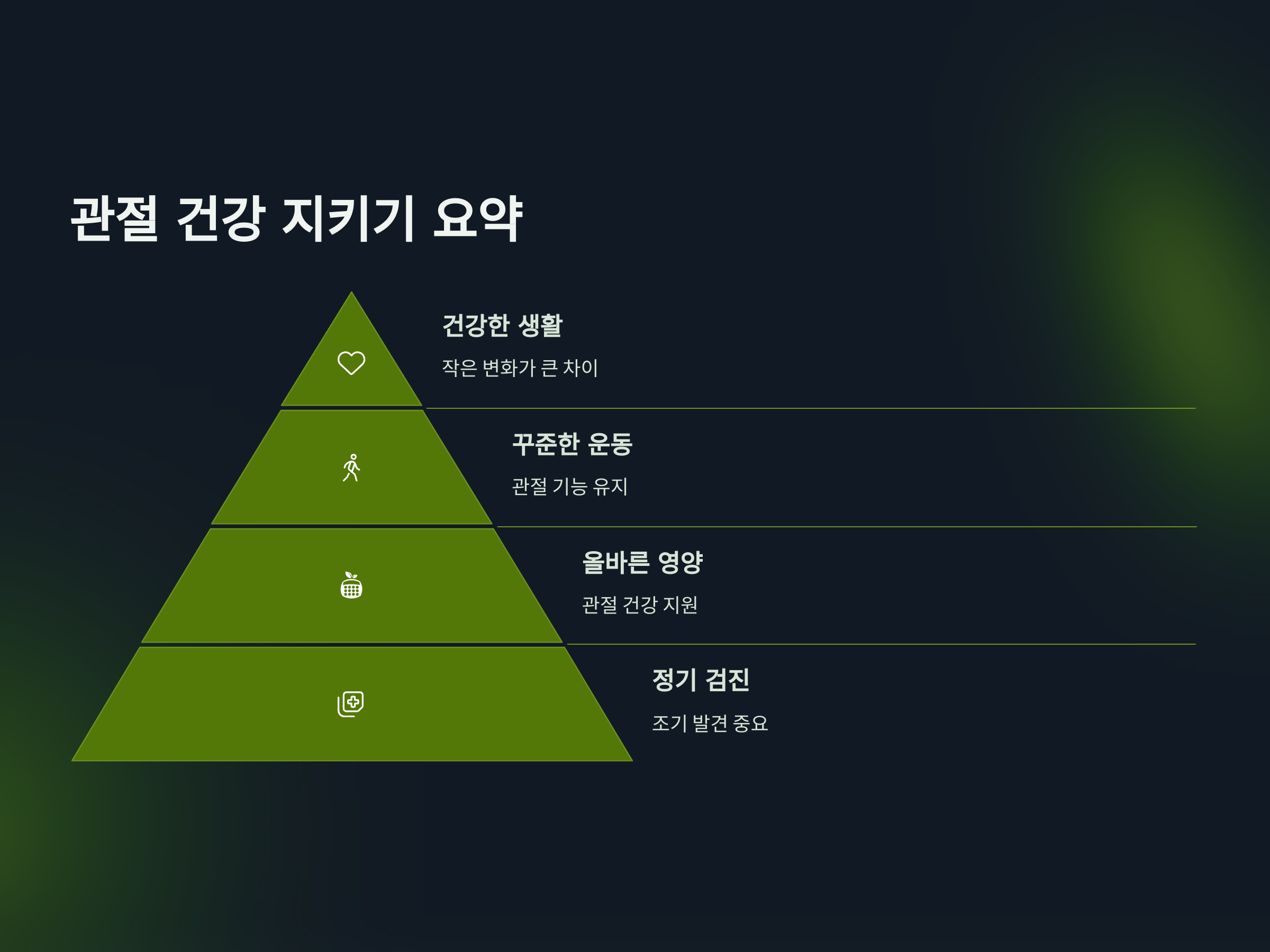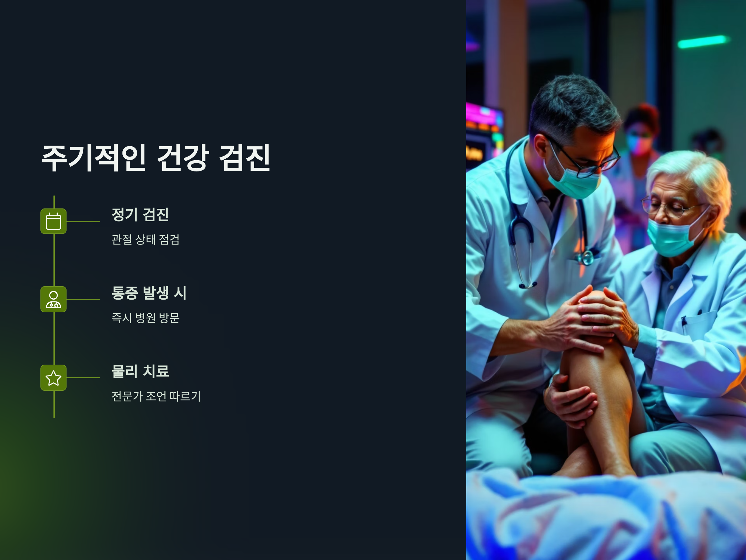 퇴행성 관절염은 초기에는 증상이 미미할 수 있기 때문에, 정기적인 건강 검진을 통해 조기에 발견하는 것이 중요합니다. 특히 관절에 통증이나 불편감이 있을 경우, 전문가와 상담하여 적절한 치료를 받는 것이 필요합니다.