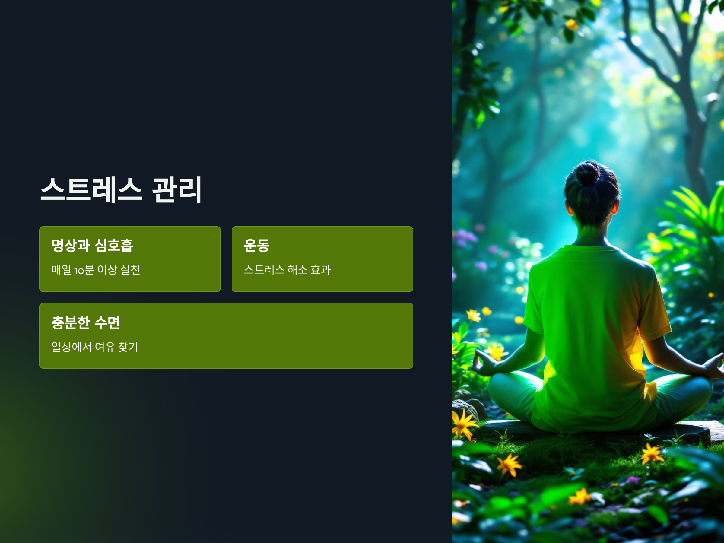 - 매일 10분 이상 심호흡이나 명상 시간을 갖습니다.