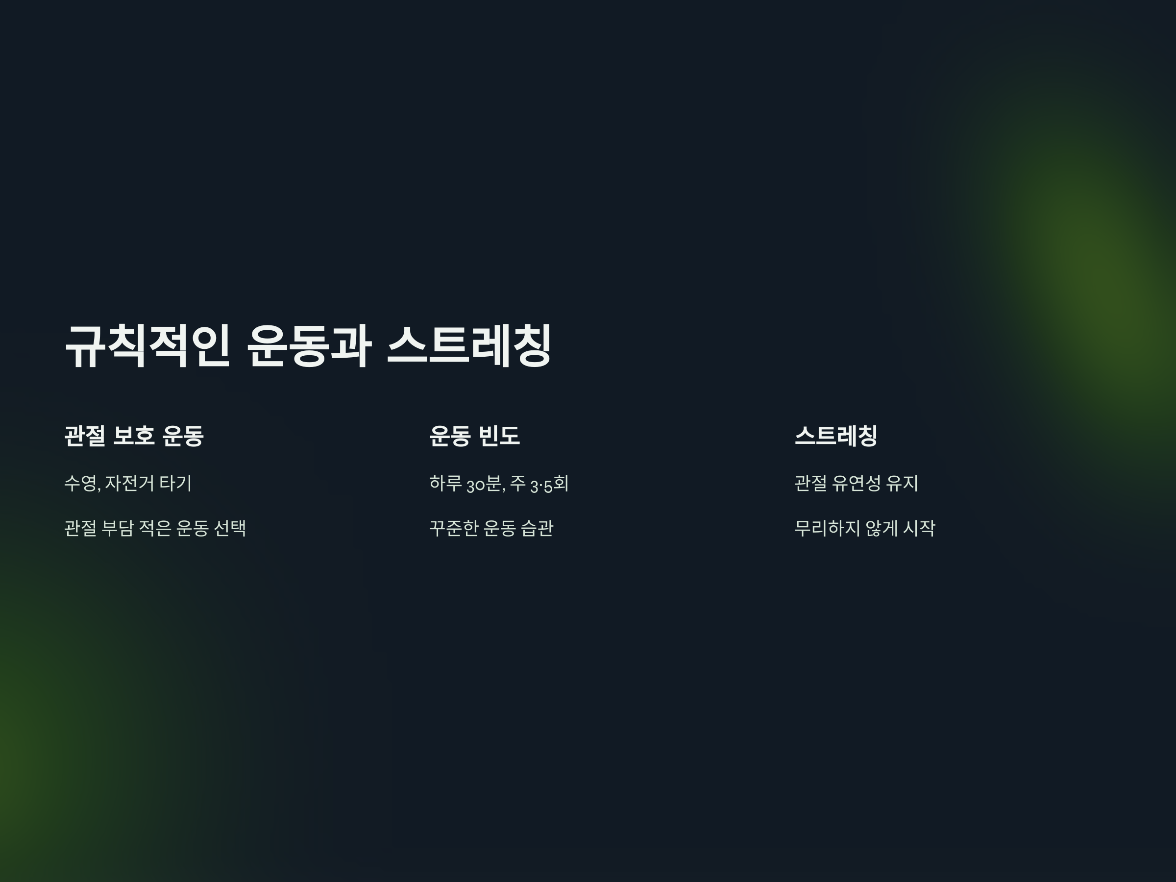 - 수영이나 자전거 타기와 같이 관절에 부담이 적은 운동을 선택합니다.