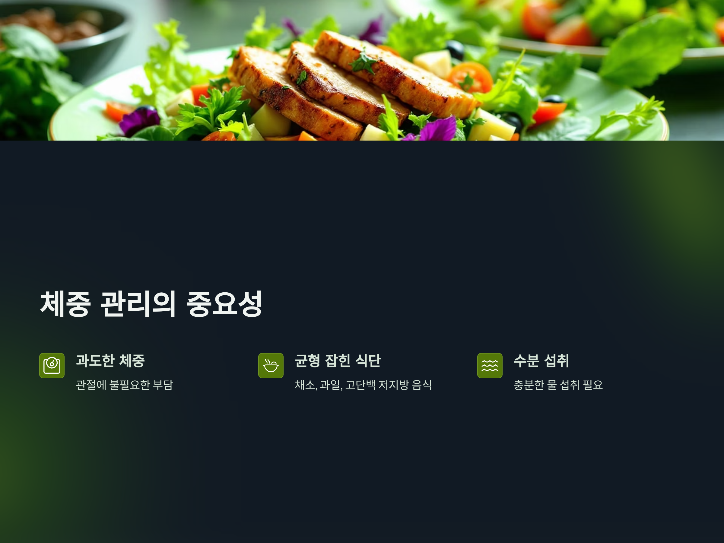 - 균형 잡힌 식단: 채소, 과일, 고단백 저지방 음식을 포함한 식단을 유지합니다.