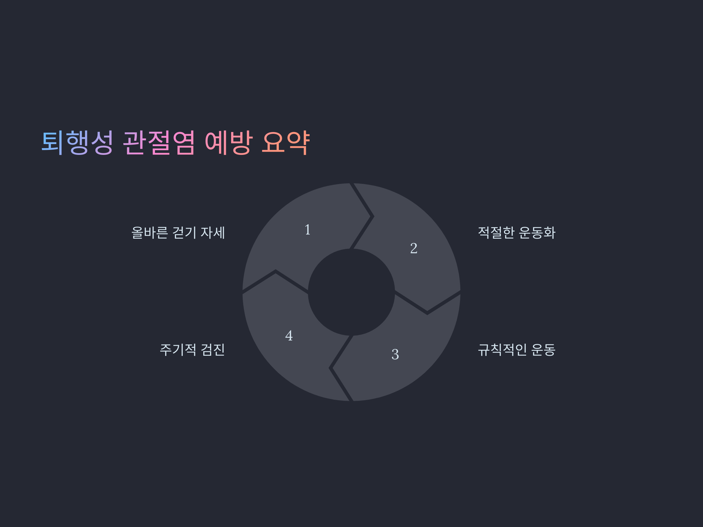 퇴행성 관절염을 예방하려면 걷기를 할 때 항상 올바른 자세를 유지하는 것이 중요하며, 꾸준히 운동을 이어가는 것이 필요합니다. 걷기 외에도 스트레칭과 근력 운동을 병행하는 것이 관절 건강에 더욱 효과적입니다.