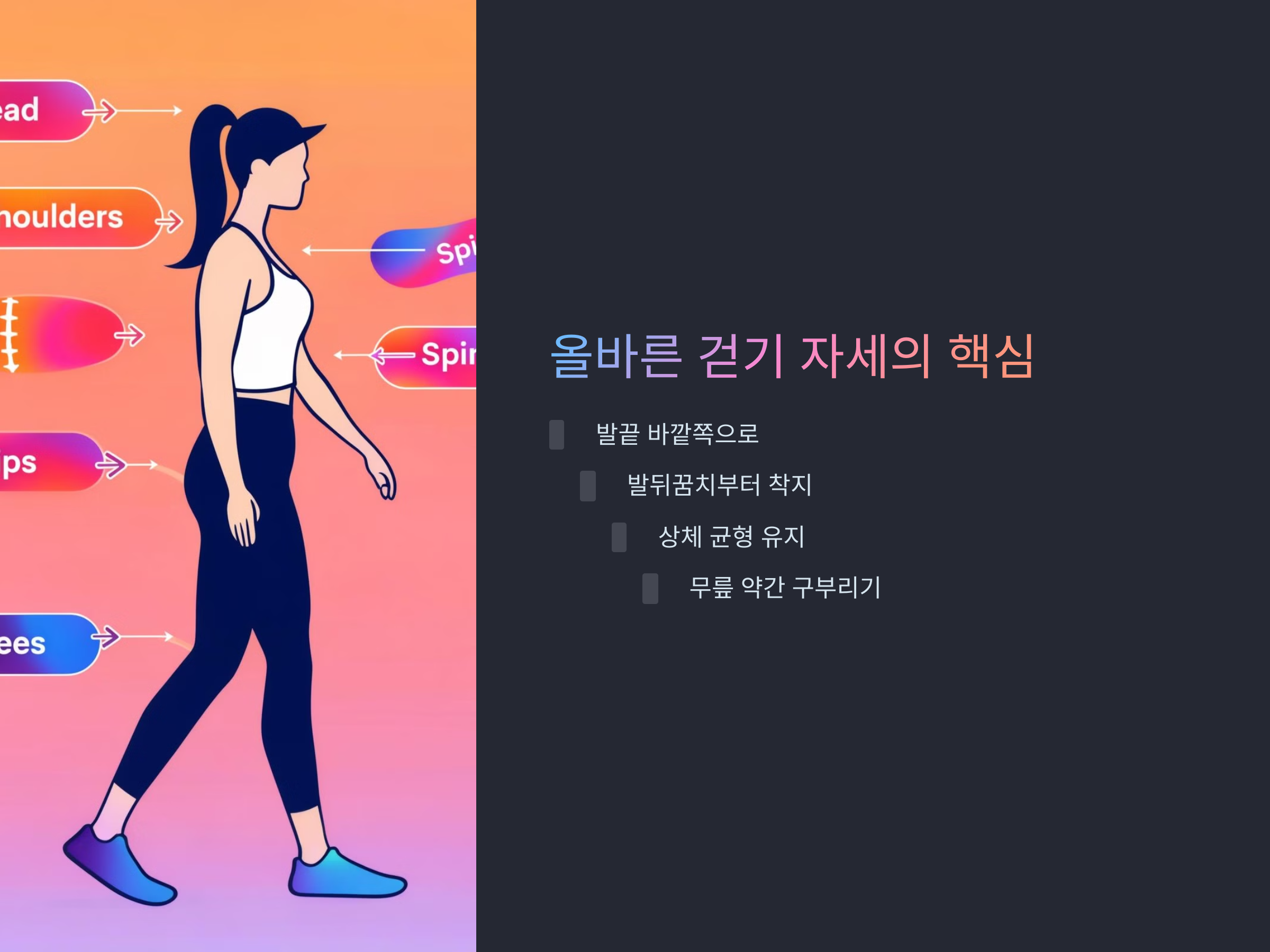 걷기 동안 상체가 너무 앞으로 기울어지거나, 반대로 너무 뒤로 젖혀지지 않도록 해야 합니다. 상체를 바르게 세운 상태로 걷는 것이 관절에 가해지는 부담을 줄이고, 균형을 잡는 데 도움이 됩니다. 특히 허리와 무릎 관절이 무리하지 않도록 하는 것이 중요합니다.