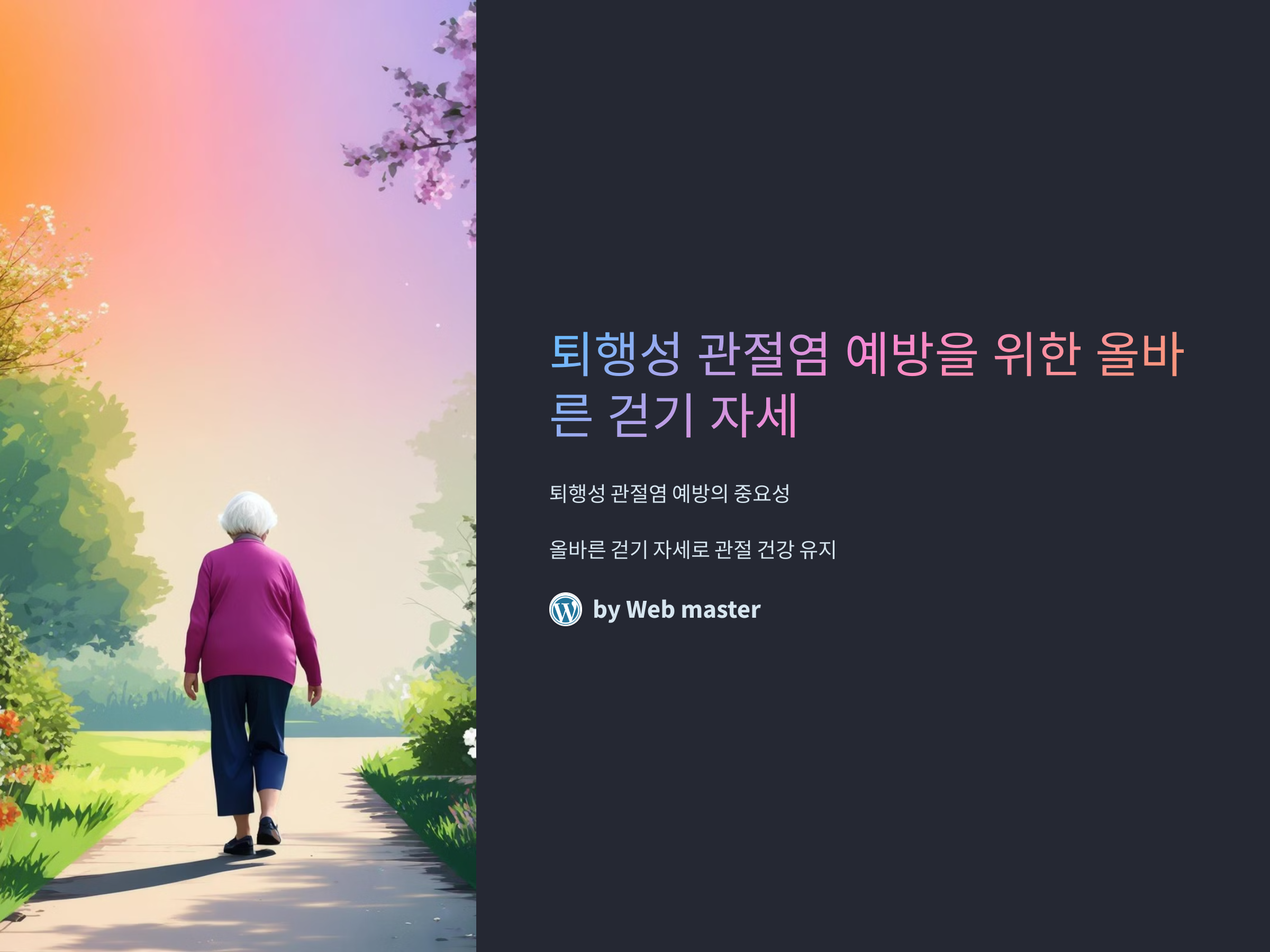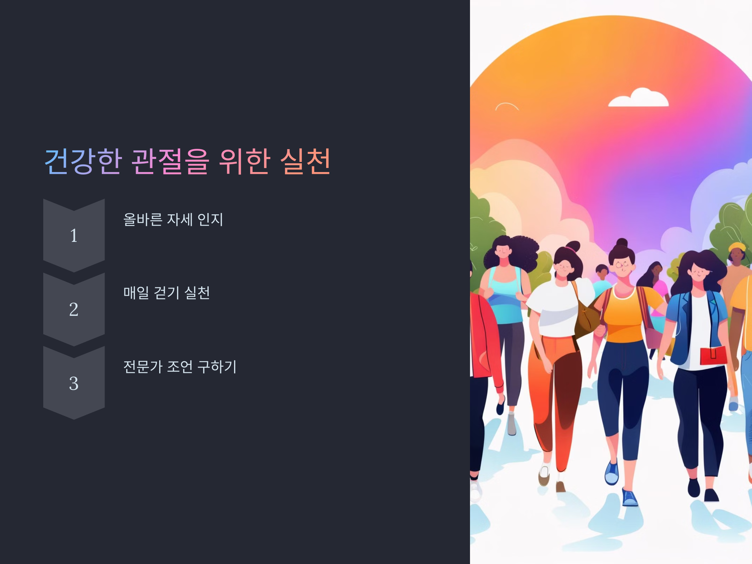 올바른 걷기 자세는 퇴행성 관절염 예방에 중요한 역할을 합니다. 오늘 배운 내용을 바탕으로, 매일 걷기 운동을 할 때 올바른 자세를 유지하여 관절 건강을 지키세요. 건강한 관절을 위해 오늘부터 실천해보세요!