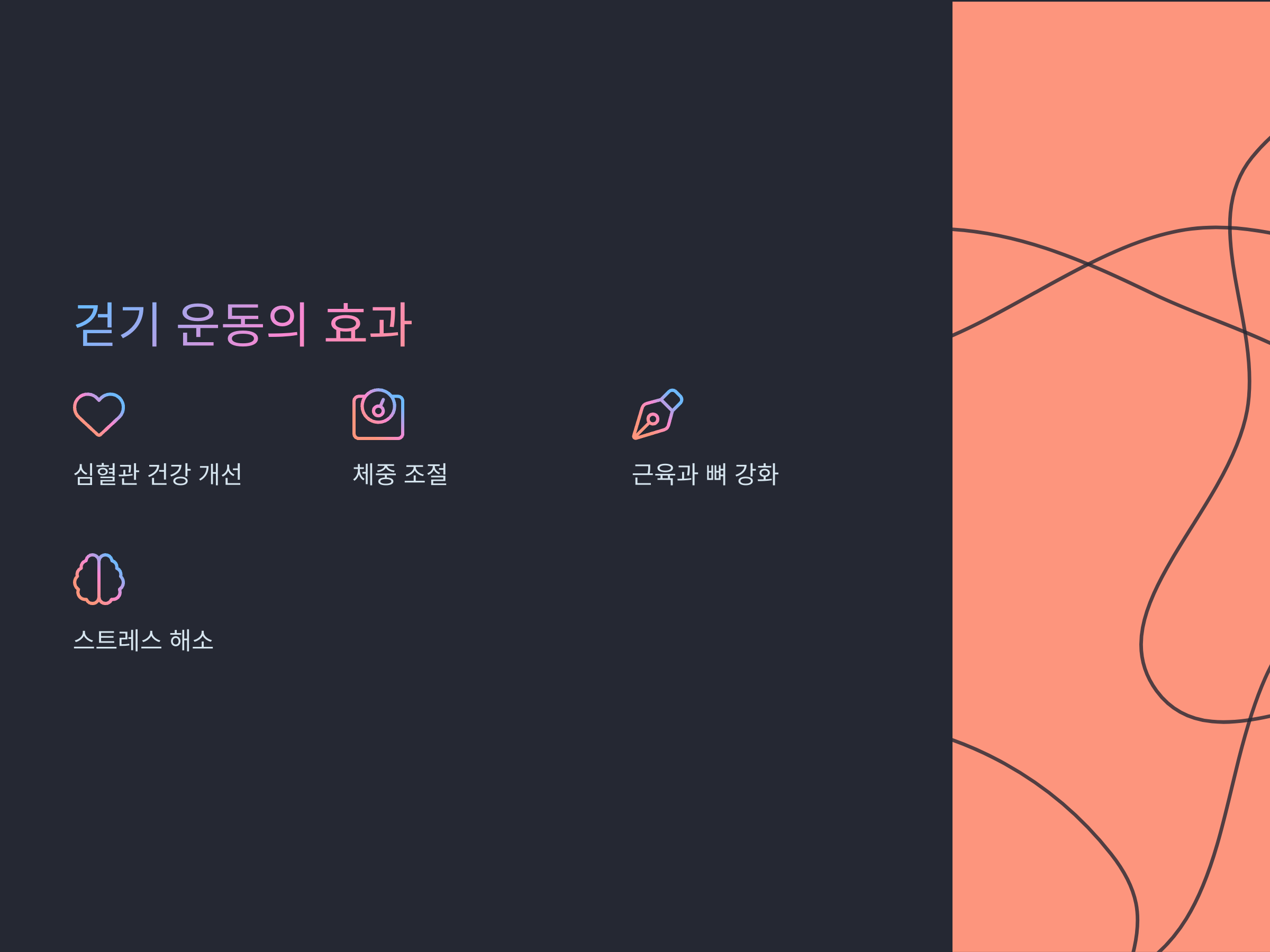 올바른 걷기 자세로 규칙적으로 걷는 것은 퇴행성 관절염 예방뿐만 아니라 전반적인 건강에도 매우 좋은 영향을 미칩니다. 걷기는 심혈관 건강을 개선하고, 체중을 조절하는 데 도움을 주며, 근육과 뼈를 강화하는 데 효과적입니다. 또한, 걷기 운동은 스트레스를 해소하고 기분을 좋게 만들어 정신적인 건강에도 긍정적인 영향을 미칩니다.
