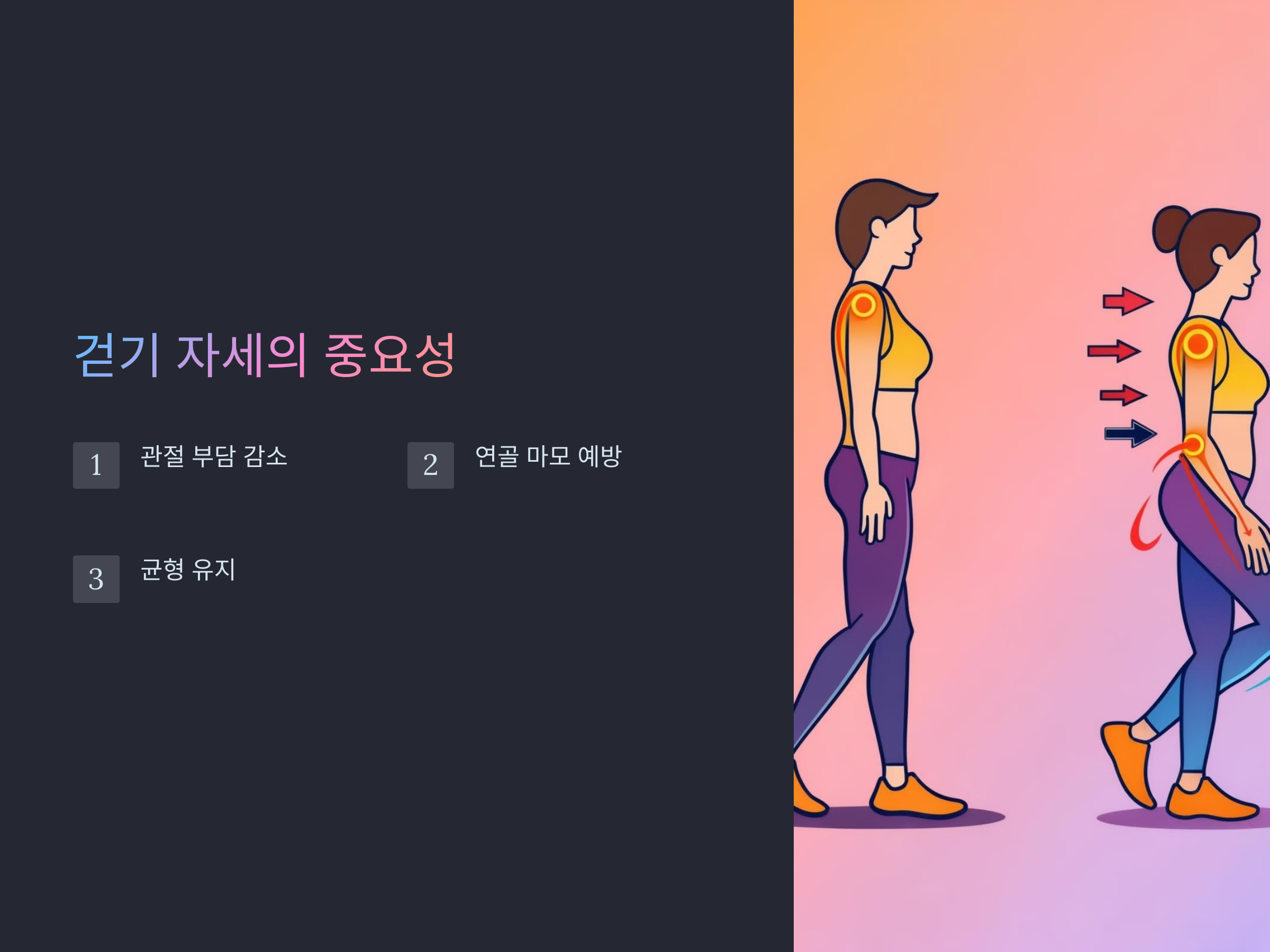 걷기는 우리가 매일 하는 기본적인 운동 중 하나입니다. 하지만 그만큼 잘못된 걷기 습관을 갖고 있다면, 퇴행성 관절염의 위험을 높일 수 있습니다. 걷기 자세가 잘못되면, 관절에 불필요한 부담을 주게 되어 시간이 지나면서 관절의 연골이 마모되고 염증이 생길 수 있습니다. 관절에 가해지는 압력을 분산시키지 못하면, 무릎, 엉덩이, 척추 등 주요 관절에 문제가 생길 수 있습니다.