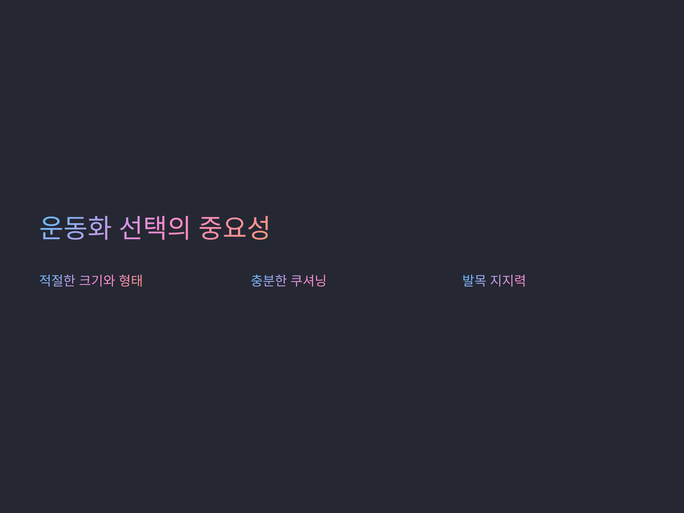 올바른 걷기 자세를 유지하기 위해서는 운동화의 선택도 중요한 요소입니다. 운동화는 발에 맞는 크기와 형태로 선택해야 하며, 충분한 쿠셔닝이 있는 제품을 선택하는 것이 좋습니다. 발바닥에 무리한 압력이 가해지지 않도록 쿠셔닝이 잘 되어 있는 운동화를 선택하는 것이 관절 건강에 좋습니다.