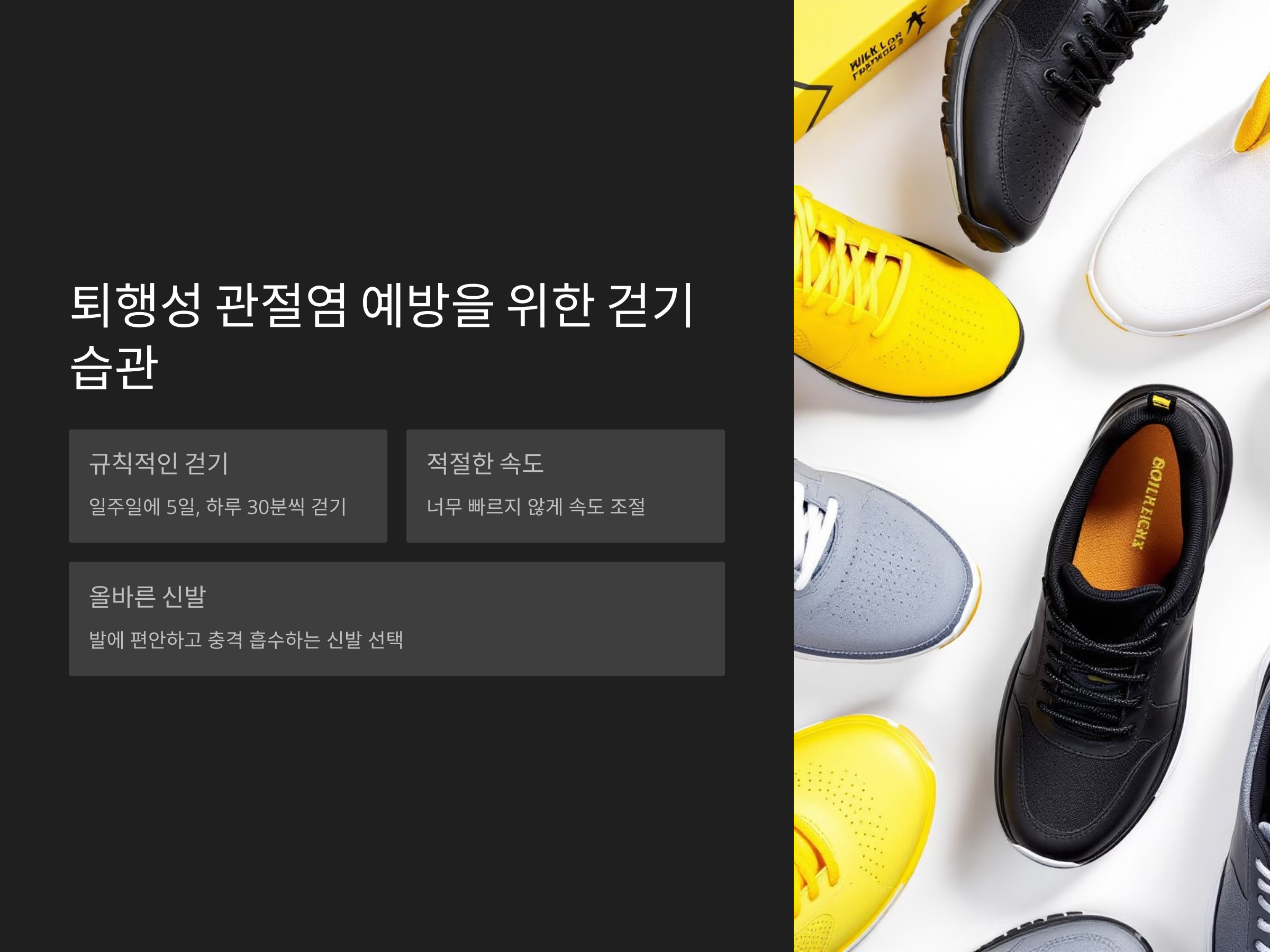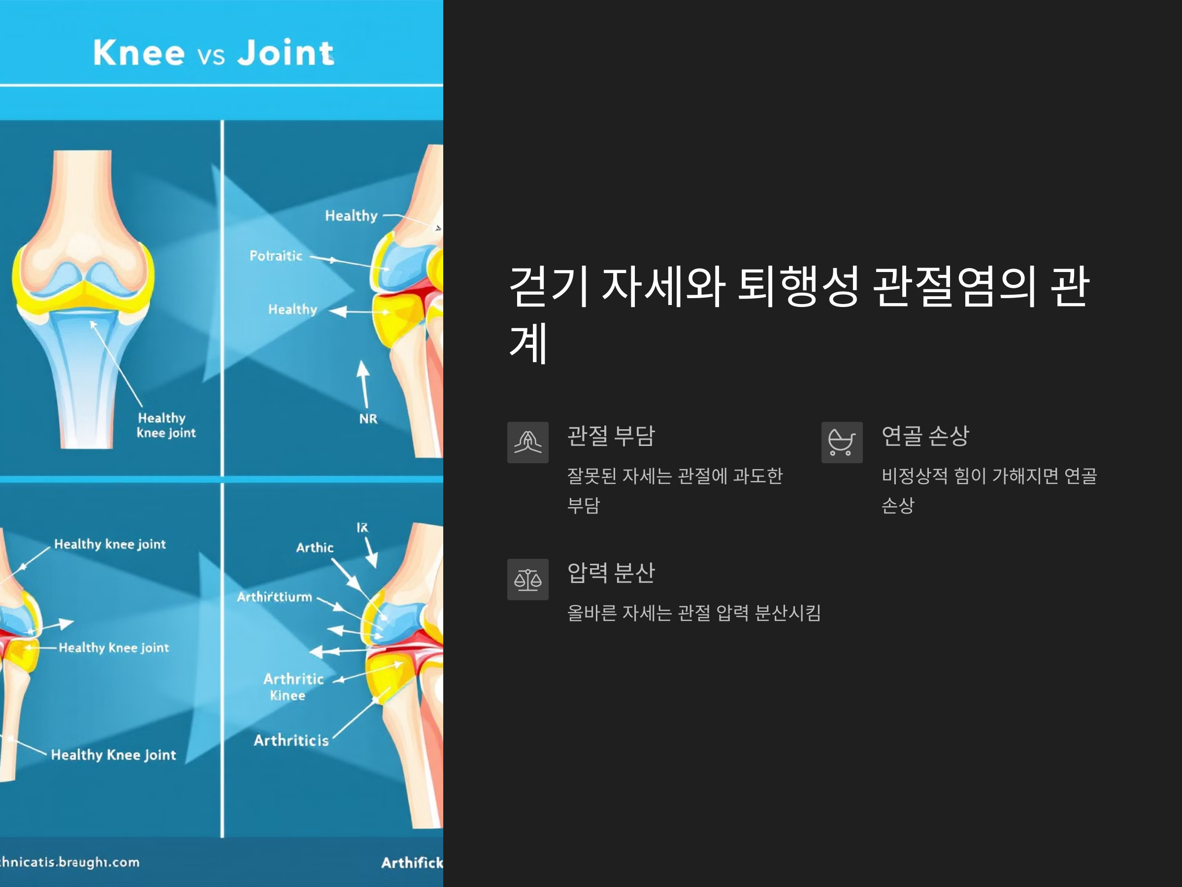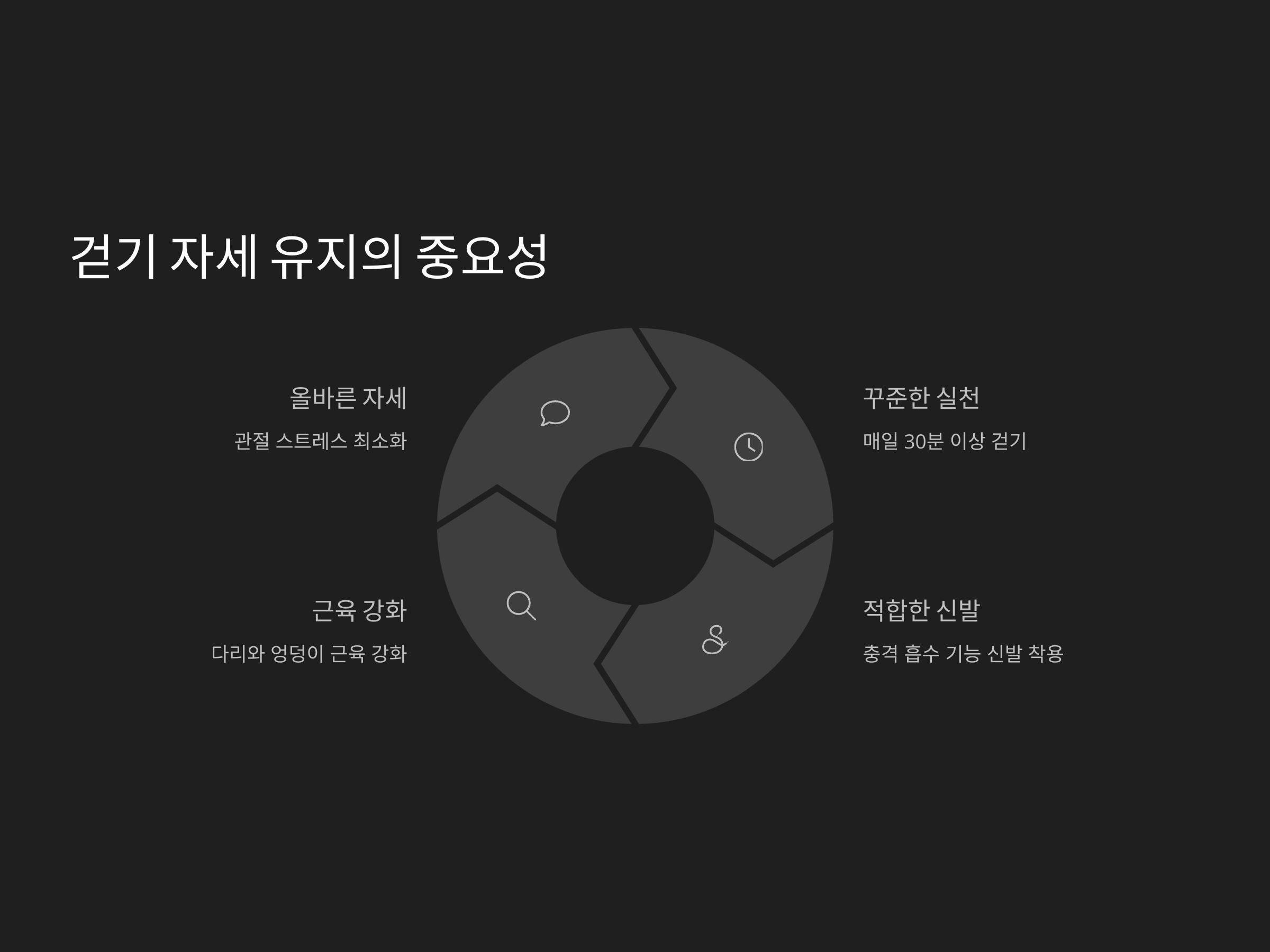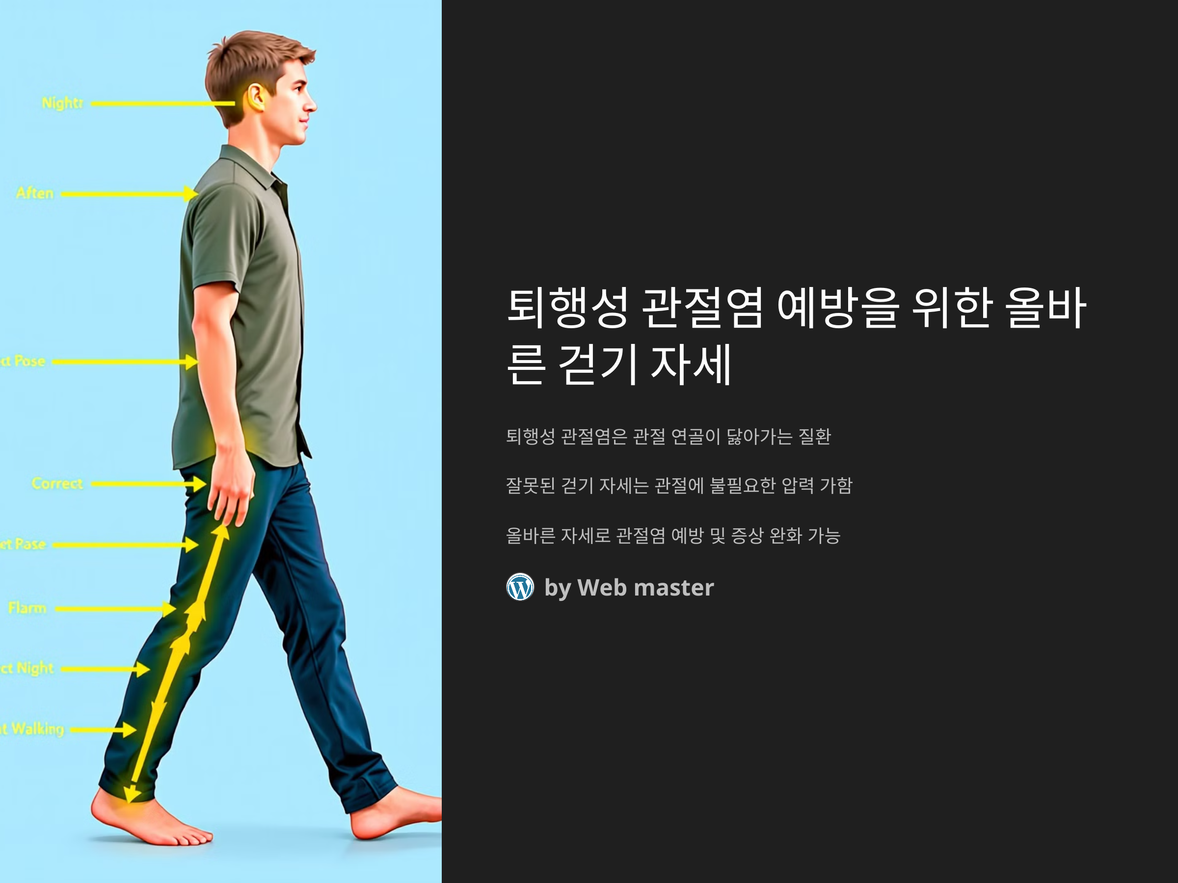 걷기 자세를 올바르게 유지하는 것은 관절에 가해지는 스트레스를 최소화하는 데 도움이 됩니다. 그러나 자세를 잘못 유지하면 관절에 불균형한 힘이 가해져 퇴행성 관절염을 유발할 수 있습니다. 따라서 매일 꾸준히 올바른 걷기 자세를 유지하는 것이 매우 중요합니다. 특히, 하루 30분 이상 걷기를 실천하며, 올바른 신발을 착용하고, 다리와 엉덩이 근육을 강화하는 운동을 병행한다면 퇴행성 관절염 예방에 큰 도움이 될 것입니다.