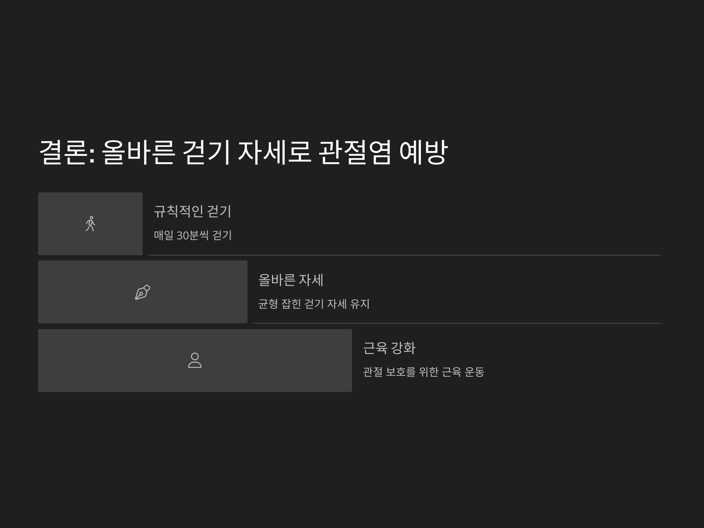 퇴행성 관절염은 예방이 중요한 질환입니다. 걷기 자세를 올바르게 유지하는 것만으로도 관절에 가해지는 부담을 크게 줄일 수 있으며, 운동을 통해 근육을 강화하면 관절의 건강을 유지하는 데 많은 도움이 됩니다. 매일 30분씩 걷고, 올바른 자세를 유지하며, 근육을 강화하는 운동을 꾸준히 실천한다면 퇴행성 관절염을 예방할 수 있습니다. 건강한 관절을 유지하기 위한 올바른 걷기 자세를 실천하세요.