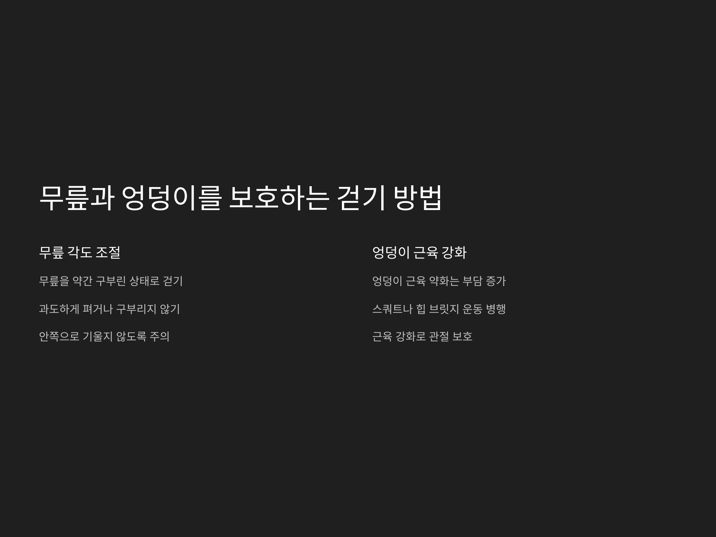 걷는 동안 무릎을 너무 많이 구부리거나 펴지 않도록 해야 합니다. 무릎을 과도하게 펴거나 구부리면 관절에 비정상적인 힘이 가해져 통증을 유발할 수 있습니다. 무릎은 약간 구부린 상태로 걷는 것이 이상적입니다. 또한, 발을 땅에 내디딜 때 무릎이 안쪽으로 기울지 않도록 주의해야 합니다.