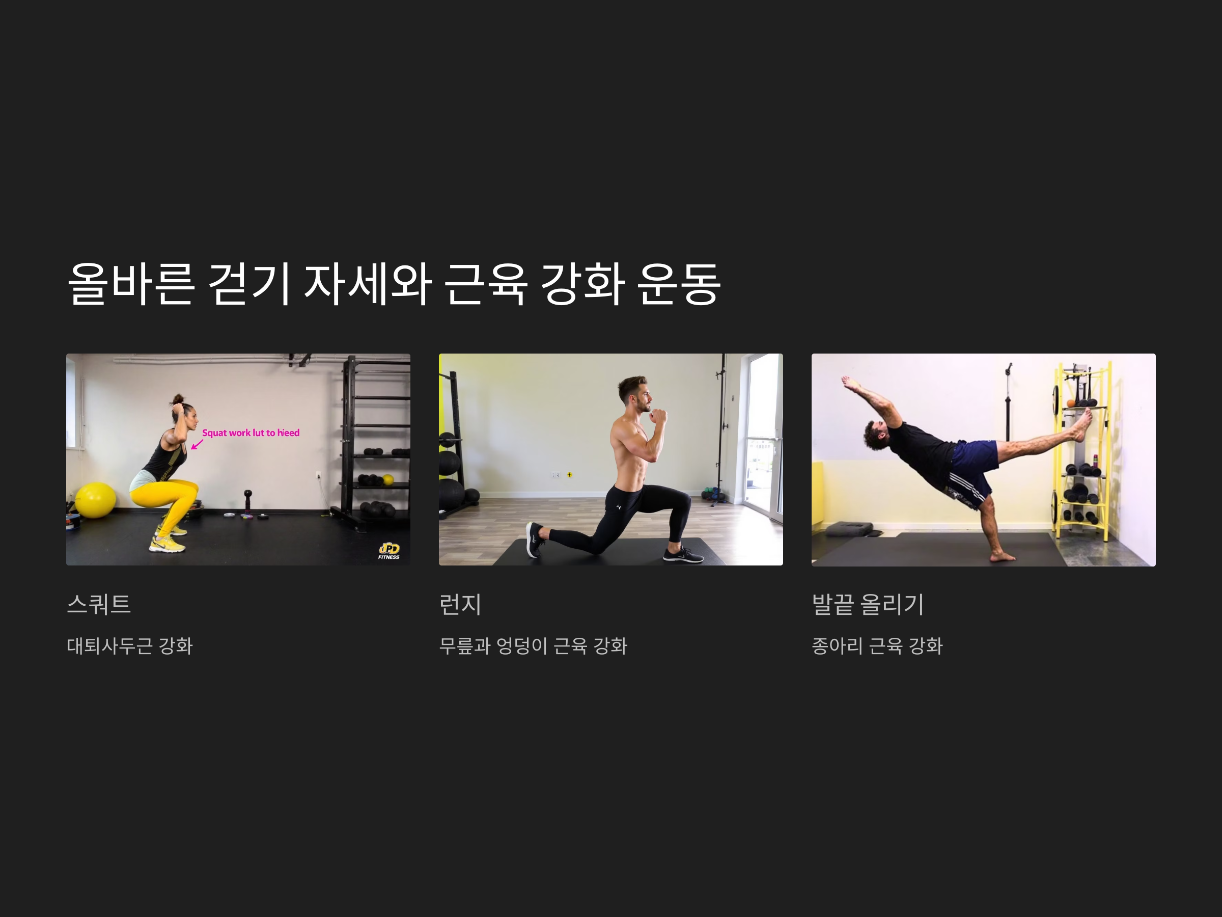 올바른 걷기 자세뿐만 아니라, 근육 강화 운동은 퇴행성 관절염 예방에 큰 도움이 됩니다. 걷기 운동을 통해 다리와 허리 근육을 강화하면, 관절에 가해지는 부담을 줄일 수 있습니다.