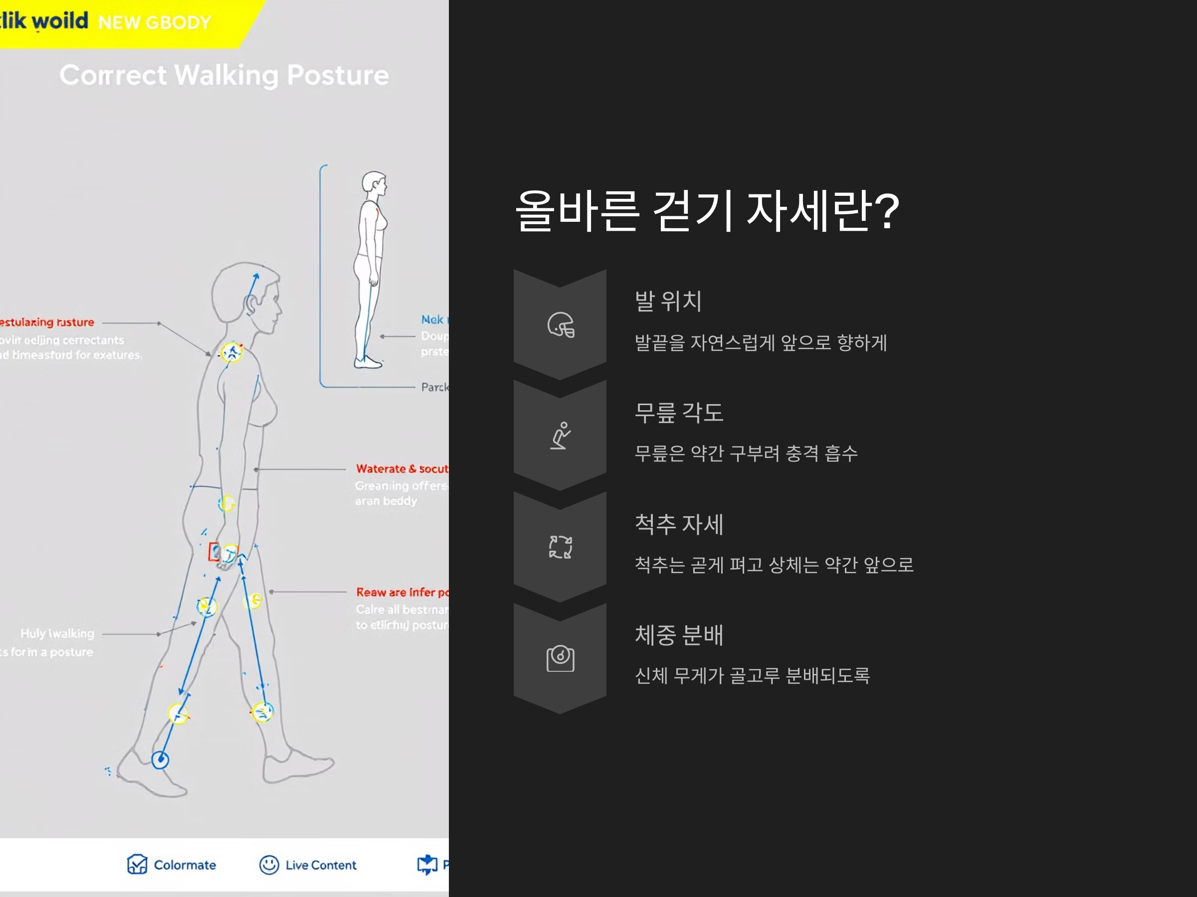올바른 걷기 자세는 신체의 무게가 골고루 분배되도록 하는 것이 핵심입니다. 걷는 동안 몸이 앞으로 기울어지거나, 너무 뒤로 젖혀지는 등의 불균형은 관절에 불필요한 부담을 줍니다. 발끝을 자연스럽게 앞으로 향하게 하고, 무릎은 약간 구부려서 발이 지면에 닿는 순간을 부드럽게 만들어야 합니다. 또한, 걷는 동안 척추는 곧게 펴고, 상체는 약간 앞쪽으로 기울여 균형을 맞추는 것이 중요합니다.
