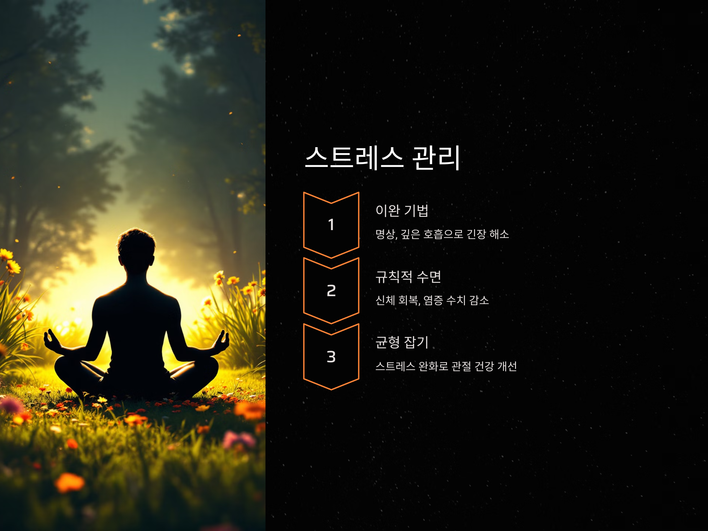 스트레스를 관리하는 방법 중 하나는 이완 기법과 명상입니다. 매일 몇 분이라도 명상이나 깊은 호흡을 통해 몸과 마음을 편안하게 하는 것이 좋습니다. 이는 몸의 긴장을 풀어주고, 스트레스를 완화시켜 관절 건강에도 긍정적인 영향을 미칩니다.