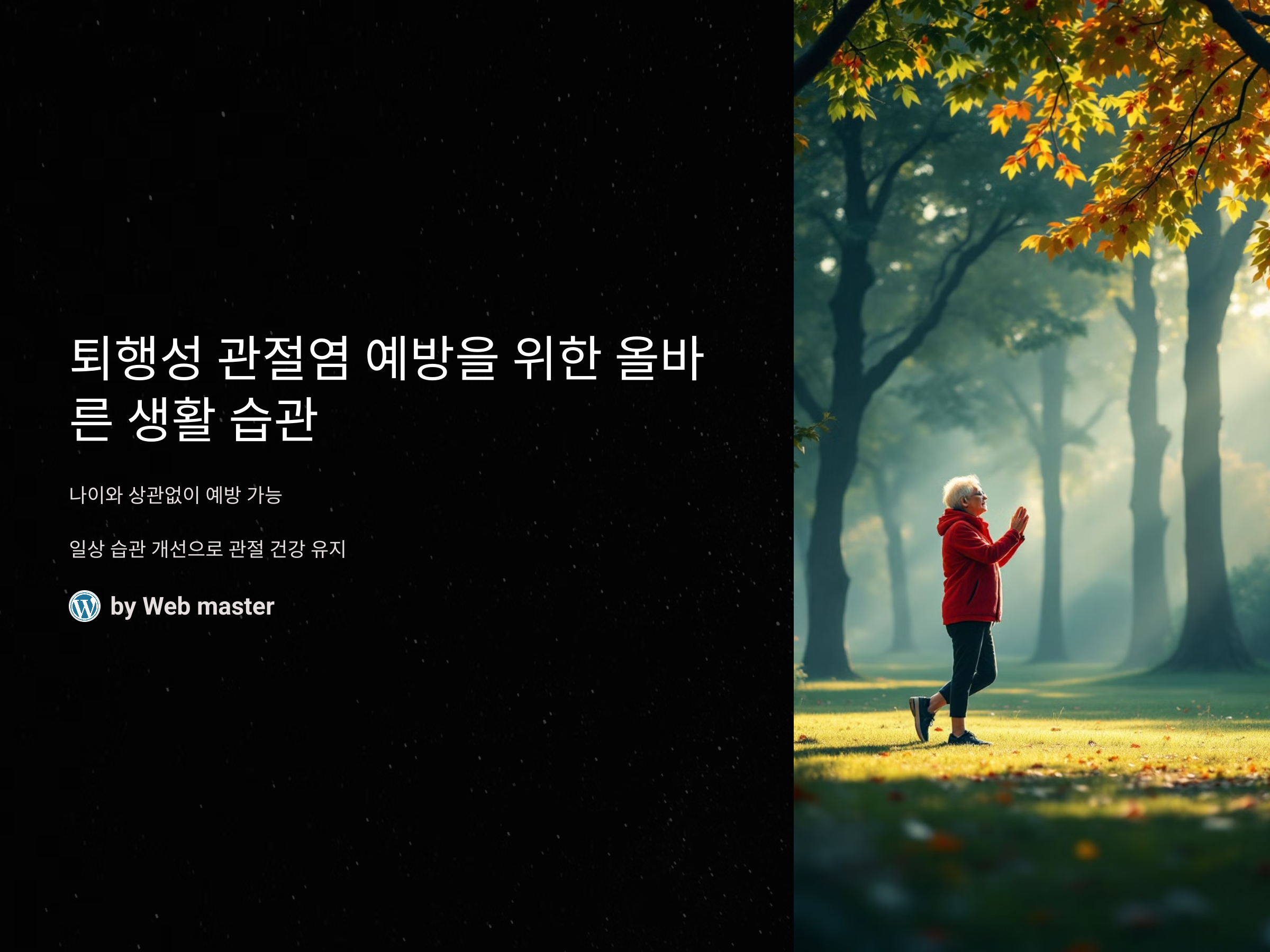 퇴행성 관절염은 예방이 가능하며, 이를 위해서는 올바른 생활 습관을 꾸준히 실천하는 것이 중요합니다. 위에서 소개한 방법들을 실천하며 관절을 보호하고, 건강한 삶을 누리시길 바랍니다.