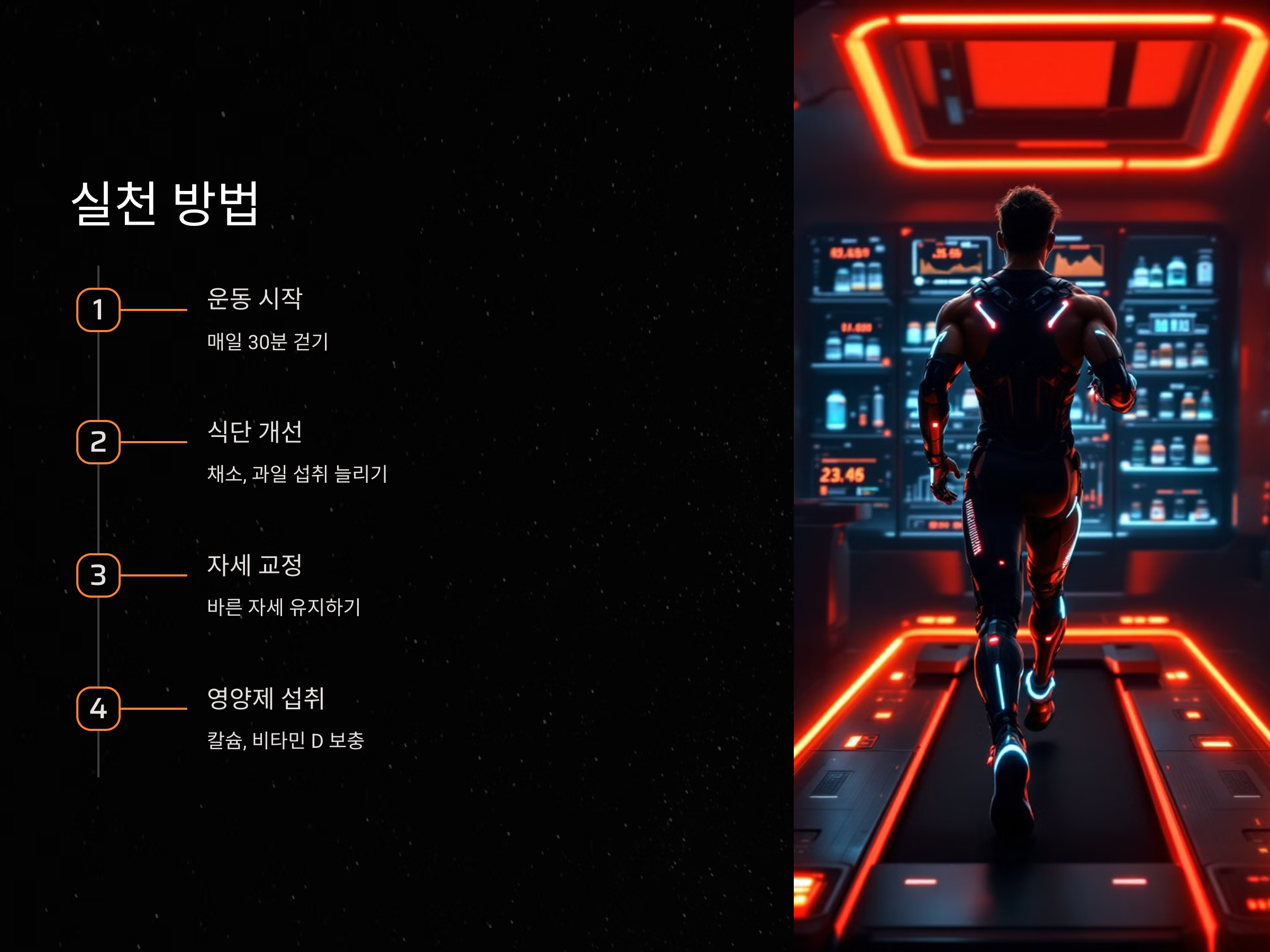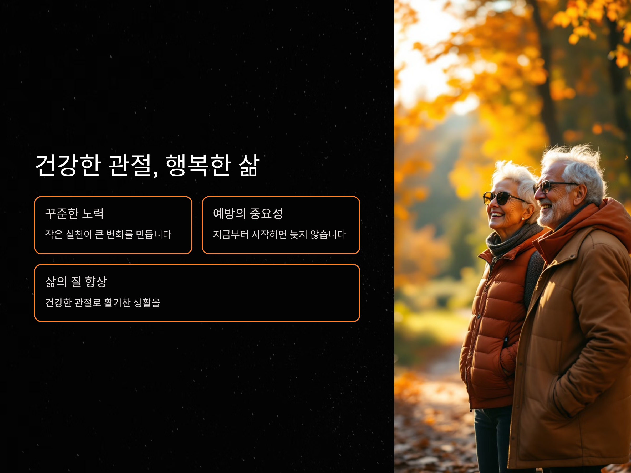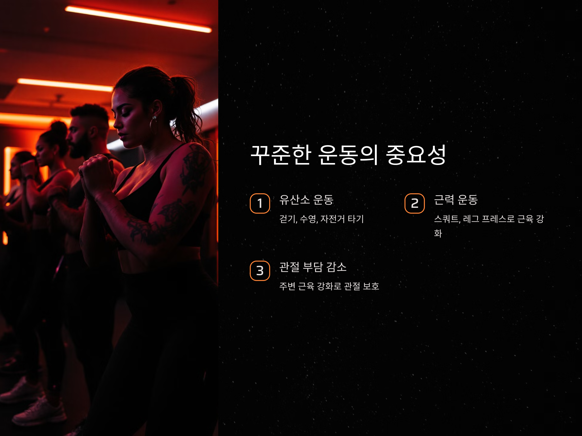 퇴행성 관절염은 예방이 가능하지만, 이를 위해서는 일상에서 꾸준한 노력이 필요합니다. 위에서 소개한 운동, 체중 관리, 자세 개선, 영양소 보충, 스트레스 관리 등 여러 가지 방법을 실천함으로써 관절을 보호하고, 퇴행성 관절염의 발생 위험을 줄일 수 있습니다. 지금 바로 실천을 시작하면, 건강한 관절을 오랫동안 유지할 수 있습니다.