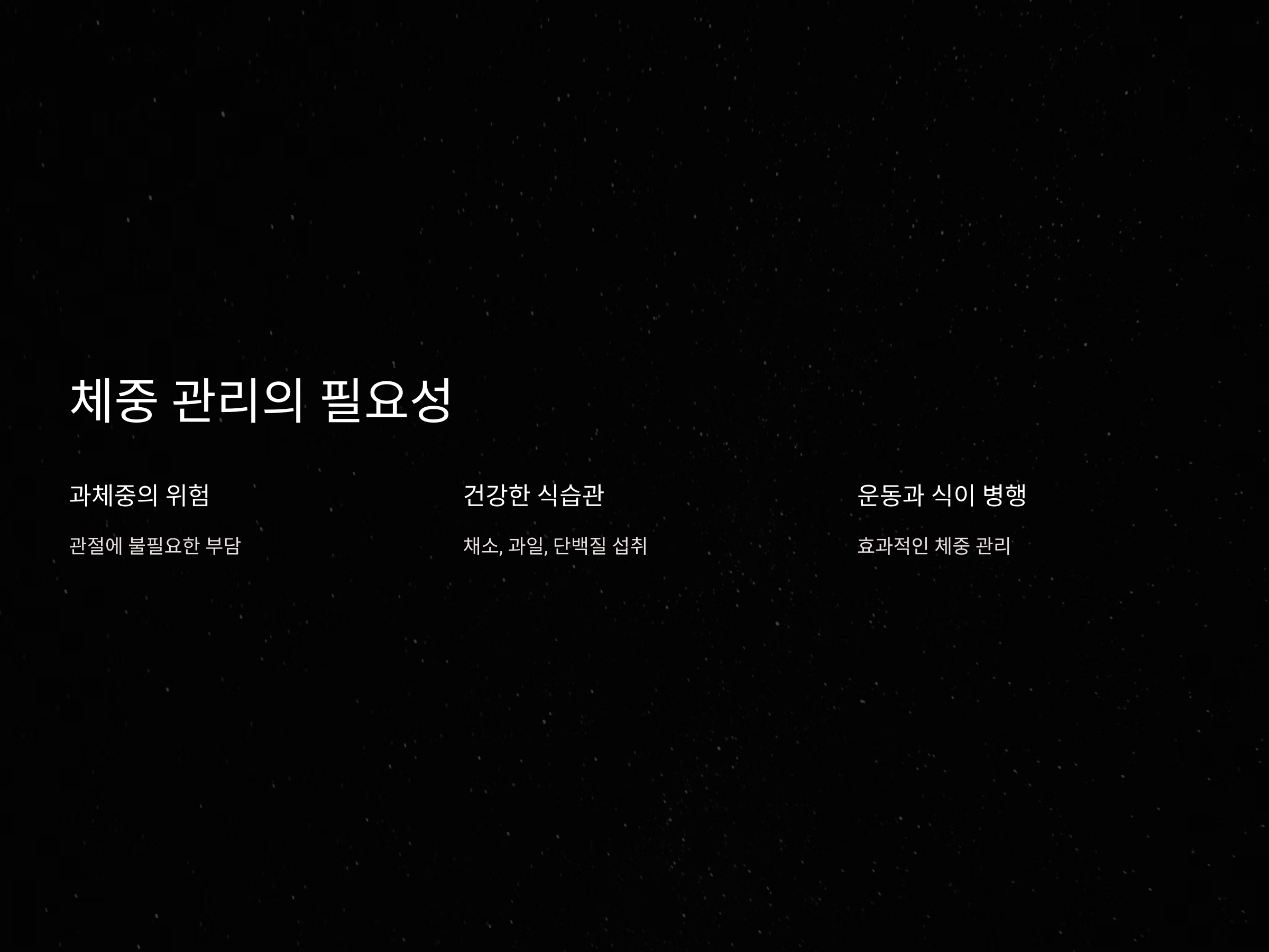 체중이 과도하게 늘어나면 무릎, 엉덩이, 허리 등 주요 관절에 불필요한 부담이 가해집니다. 과체중이나 비만은 퇴행성 관절염을 악화시킬 수 있는 주요 원인 중 하나입니다. 따라서 적정 체중을 유지하는 것이 매우 중요합니다.