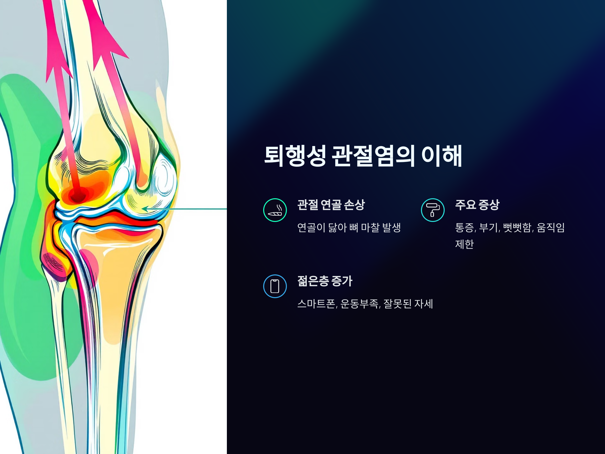 퇴행성 관절염은 관절의 연골이 점차 닳아 없어지며 발생하는 만성 질환으로, 주로 무릎, 엉덩이, 손가락 관절 등에 발생합니다. 대부분의 사람은 중년 이후부터 증상이 나타나기 시작하지만, 최근엔 스마트폰 사용, 운동 부족, 잘못된 자세 등으로 인해 젊은 층에서도 초기 증상이 나타나는 사례가 늘고 있습니다.