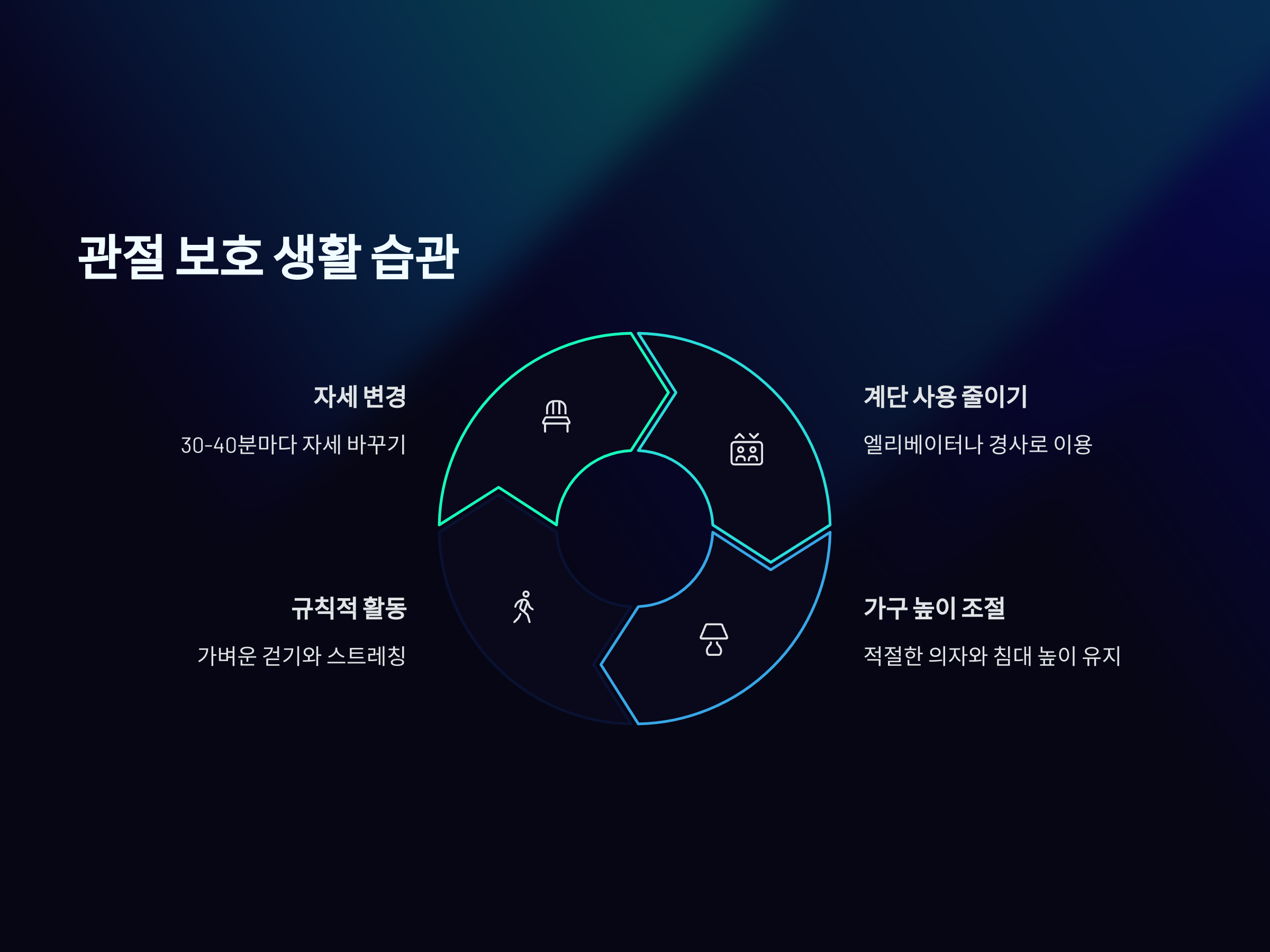 퇴행성 관절염의 진행을 막기 위해선 단순한 운동이나 약물 복용을 넘어서, 전반적인 라이프스타일의 조정이 필요합니다. 많은 전문가들은 아래와 같은 포괄적 접근을 권장하고 있습니다.