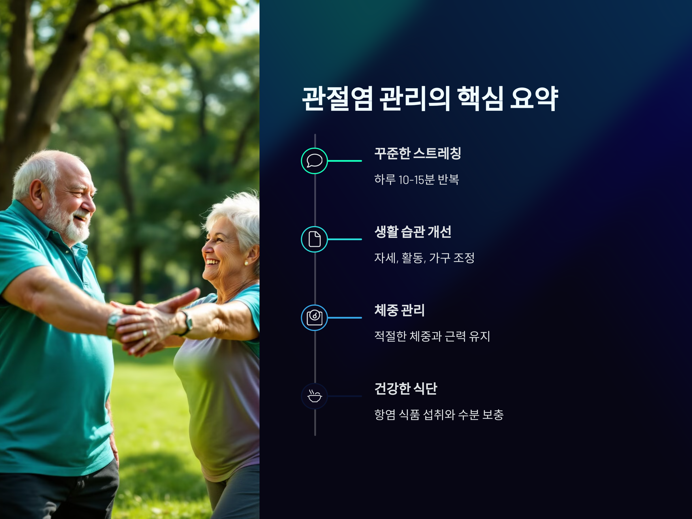 전문가들은 "관절염은 늙어서 생기는 병이 아니라, 관리하지 않아서 생기는 병"이라고 강조합니다. 그렇기에 조기에 관리 습관을 들이고, 내게 맞는 스트레칭과 식습관을 실천하는 것이 가장 중요한 예방법입니다.