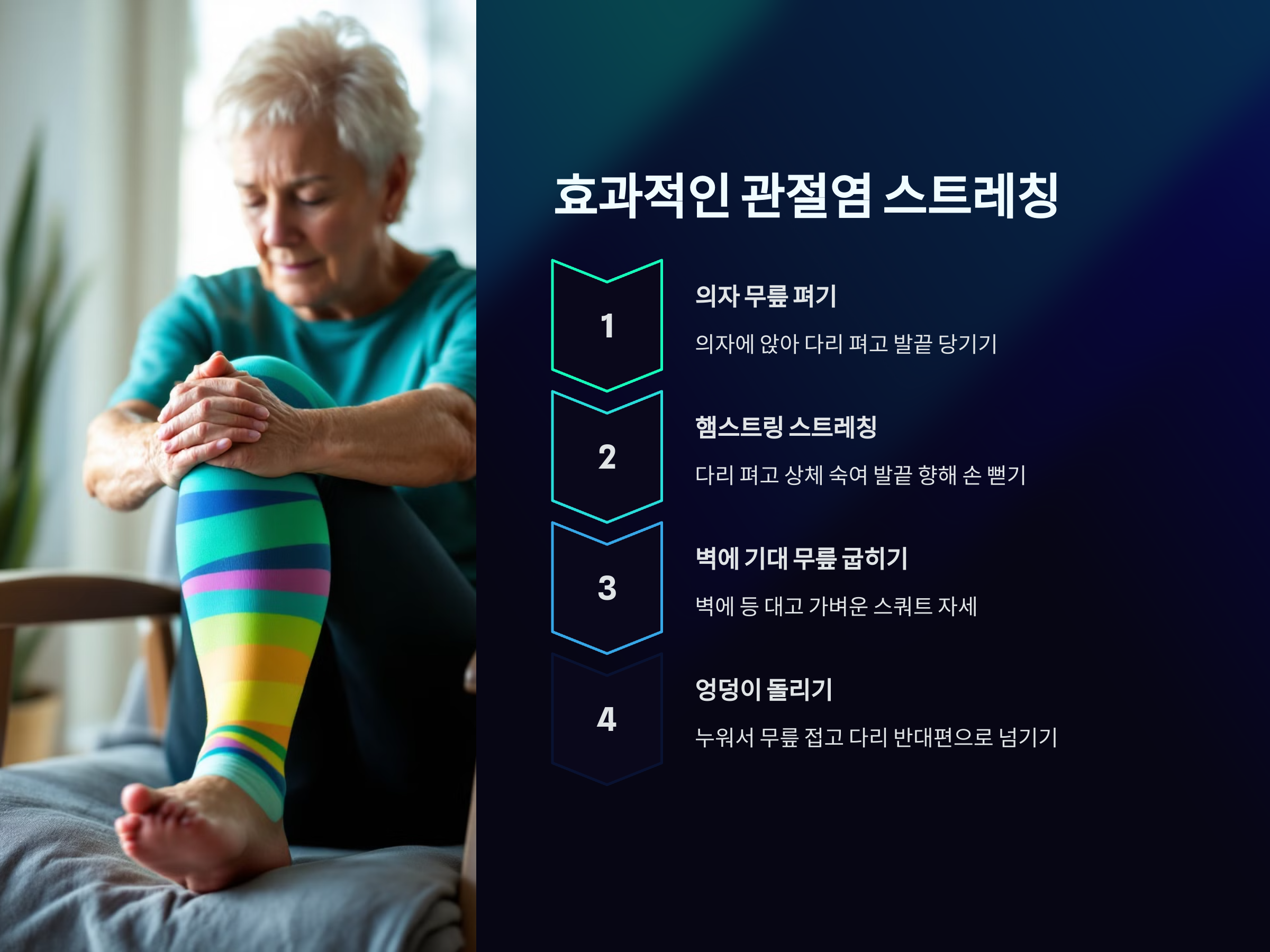 관절염 환자에게 가장 중요한 운동 원칙은 ‘무리가 가지 않는 범위에서 꾸준히’입니다. 특히 스트레칭은 관절의 가동 범위를 넓히고, 경직된 근육을 풀어주며, 통증을 완화하는 데 도움을 줍니다. 전문가들이 권장하는 대표 스트레칭은 다음과 같습니다.