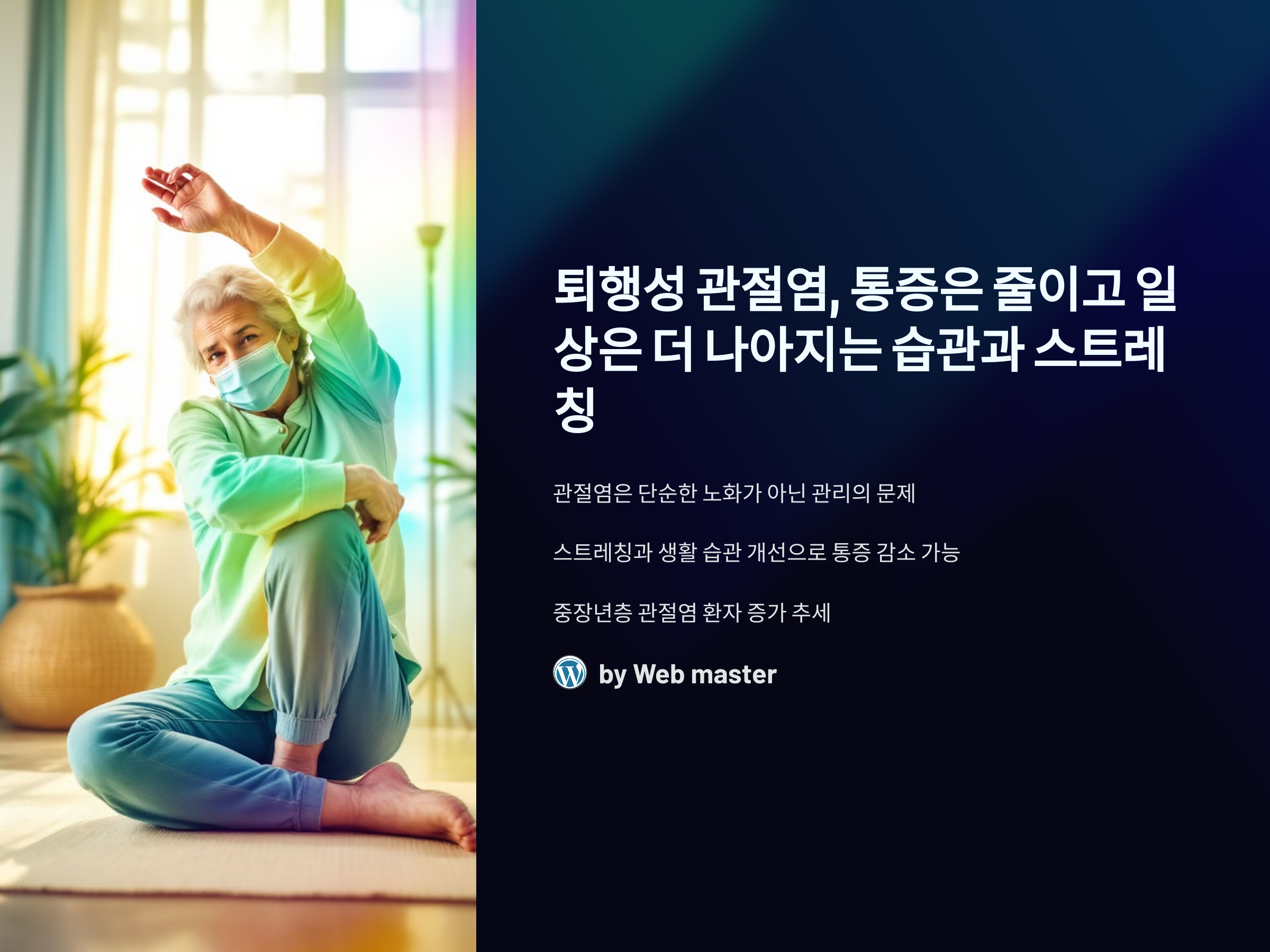 이번 포스팅에서는 전문가가 추천하는 퇴행성 관절염에 특화된 스트레칭 동작과, 일상에서 실천할 수 있는 관절 보호 습관을 자세히 소개하며, 효과적인 실천 방법과 주의사항까지 안내합니다. 간단한 습관 하나만 바꿔도 관절이 덜 아프고, 움직임이 더 가벼워질 수 있다는 점에서 누구나 꼭 실천해보시길 권합니다.