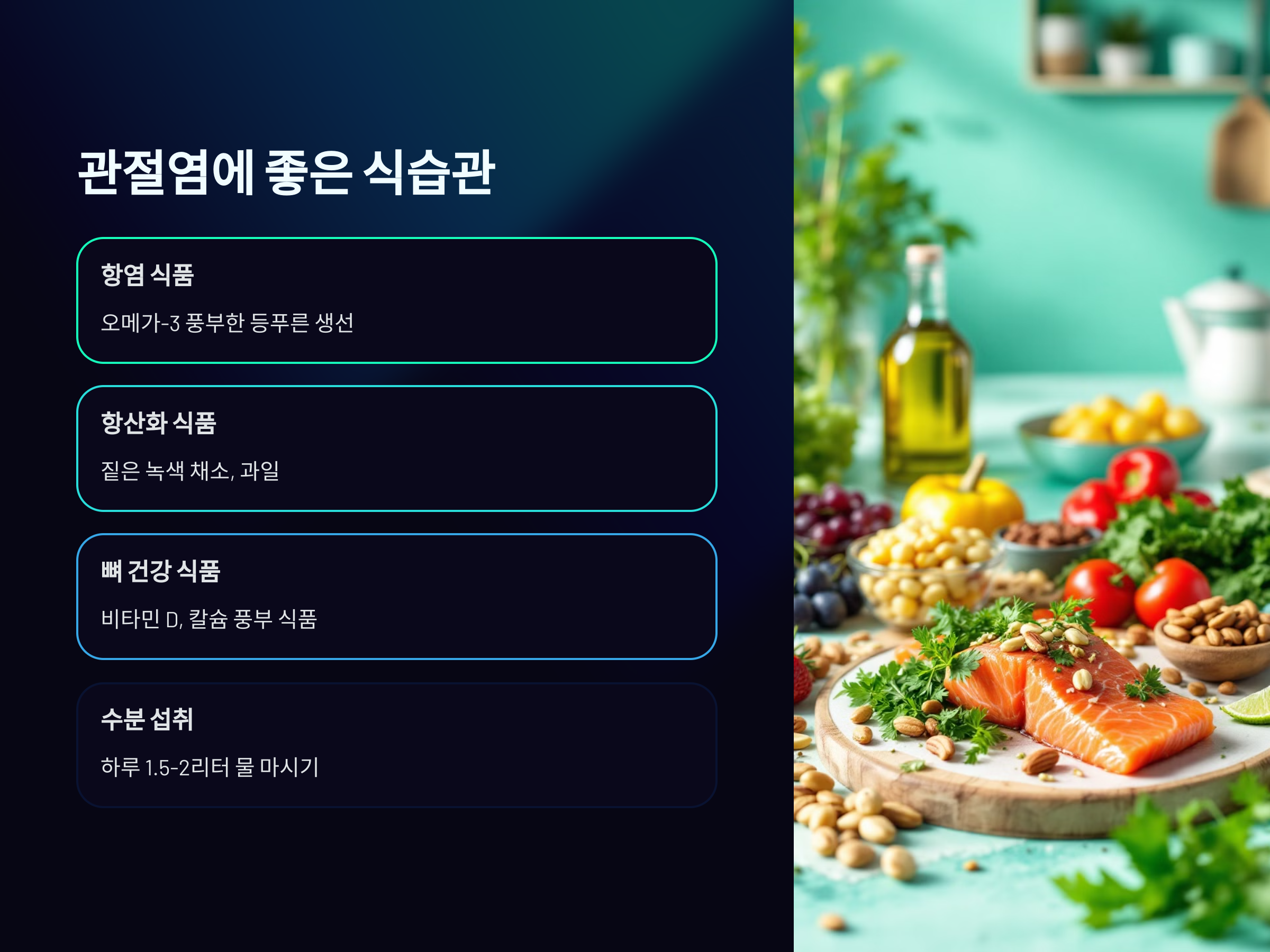 관절염을 완화시키는 데 도움이 되는 음식과 그렇지 않은 음식을 잘 구분해 섭취하는 것도 매우 중요합니다. 특히 항염 작용이 있는 오메가-3 지방산, 항산화 성분이 풍부한 채소와 과일, 비타민 D와 칼슘이 풍부한 식품이 도움이 됩니다.