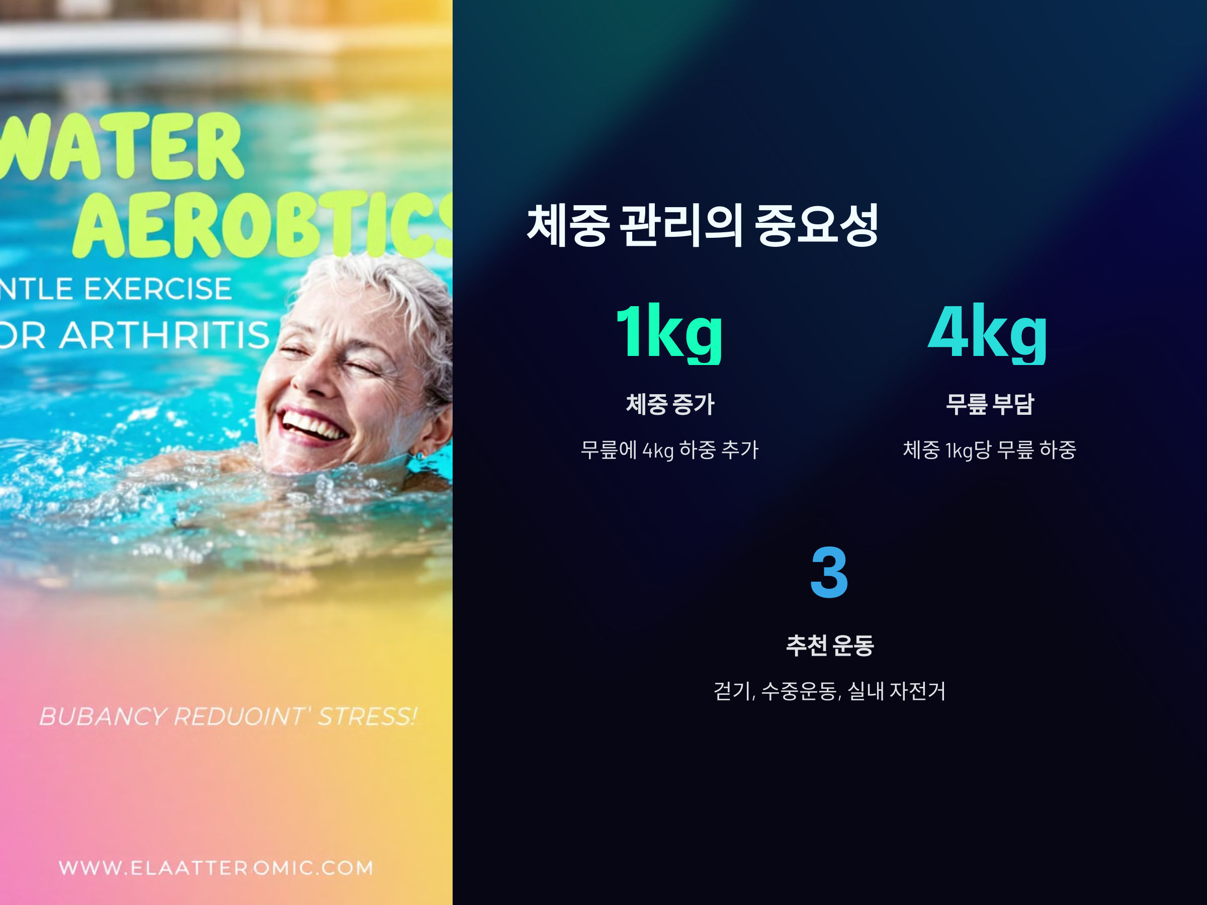 일상 속에서 무리 없이 실천할 수 있는 걷기 운동, 수중 운동, 실내 자전거 타기 등은 관절에 무리를 덜 주면서도 체중 관리에 효과적인 운동입니다. 특히 수중 운동은 부력으로 인해 관절 부담이 줄어들어 관절염 환자에게 최적의 운동법으로 꼽힙니다.