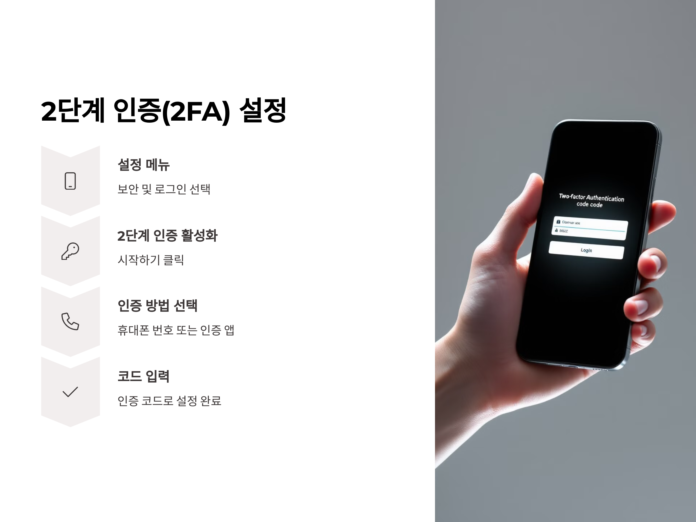 두 번째로, 2단계 인증(2FA)을 활성화하는 것입니다. 2단계 인증은 비밀번호 외에 추가적인 보안 단계로, 계정에 로그인할 때마다 휴대폰으로 전송되는 인증 코드를 입력해야 합니다. 이를 통해 해커가 비밀번호를 알아내도, 로그인할 수 없게 됩니다.