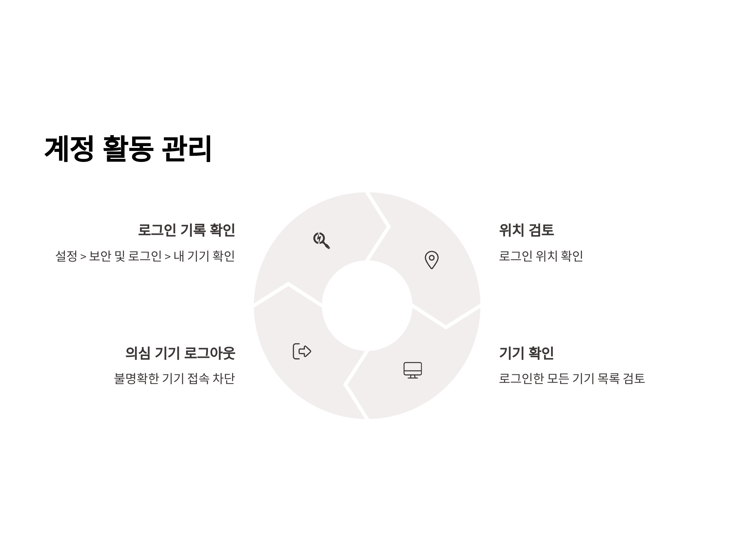- 내가 알지 못하는 기기에서 로그인 기록이 있으면, 해당 기기에서 로그아웃하고 비밀번호를 변경합니다.