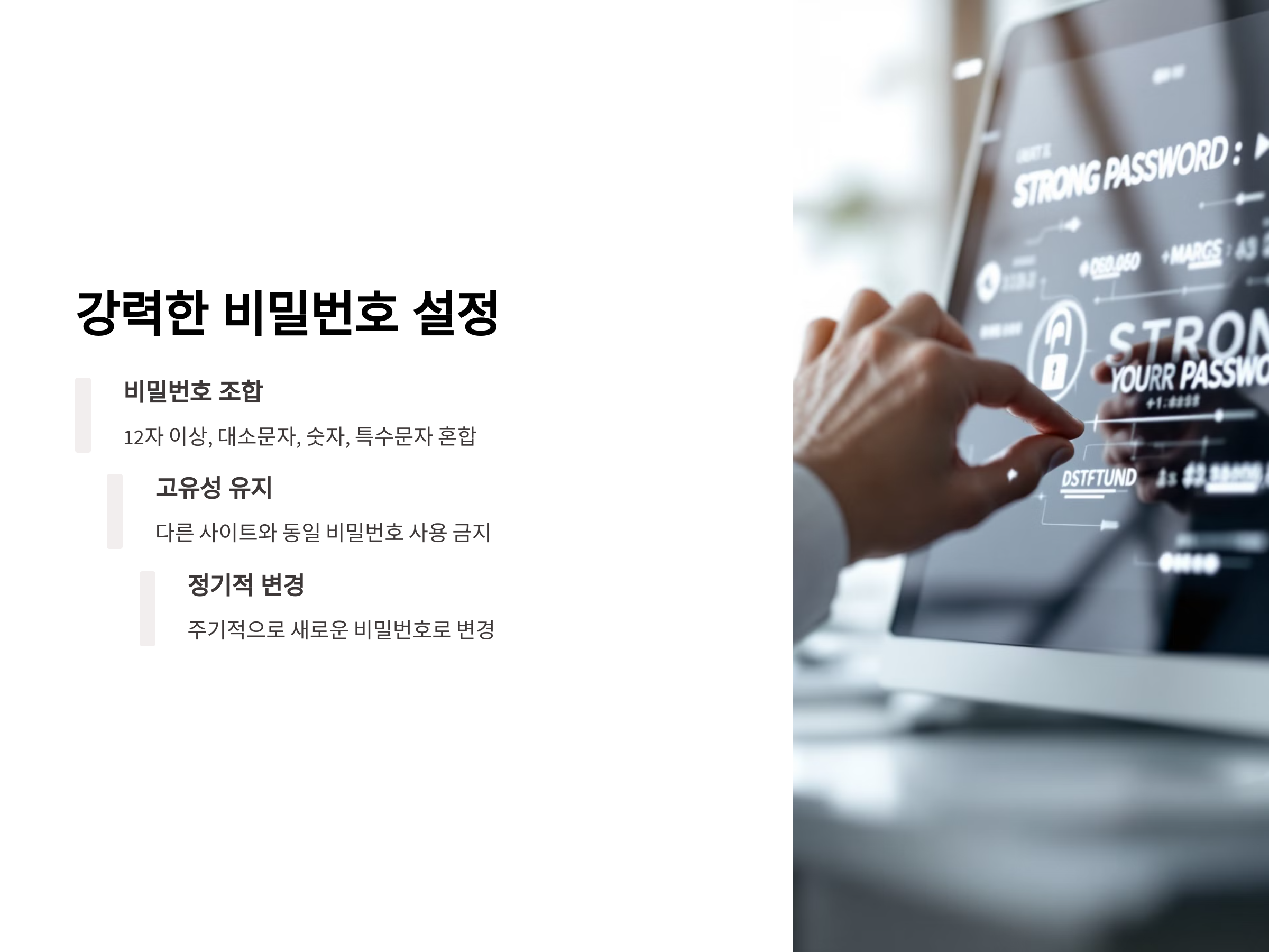 강력한 비밀번호는 계정 보안의 첫 번째 방어선입니다. 다른 서비스와 동일한 비밀번호를 사용하는 것을 피하고, 주기적으로 변경하는 것이 좋습니다.