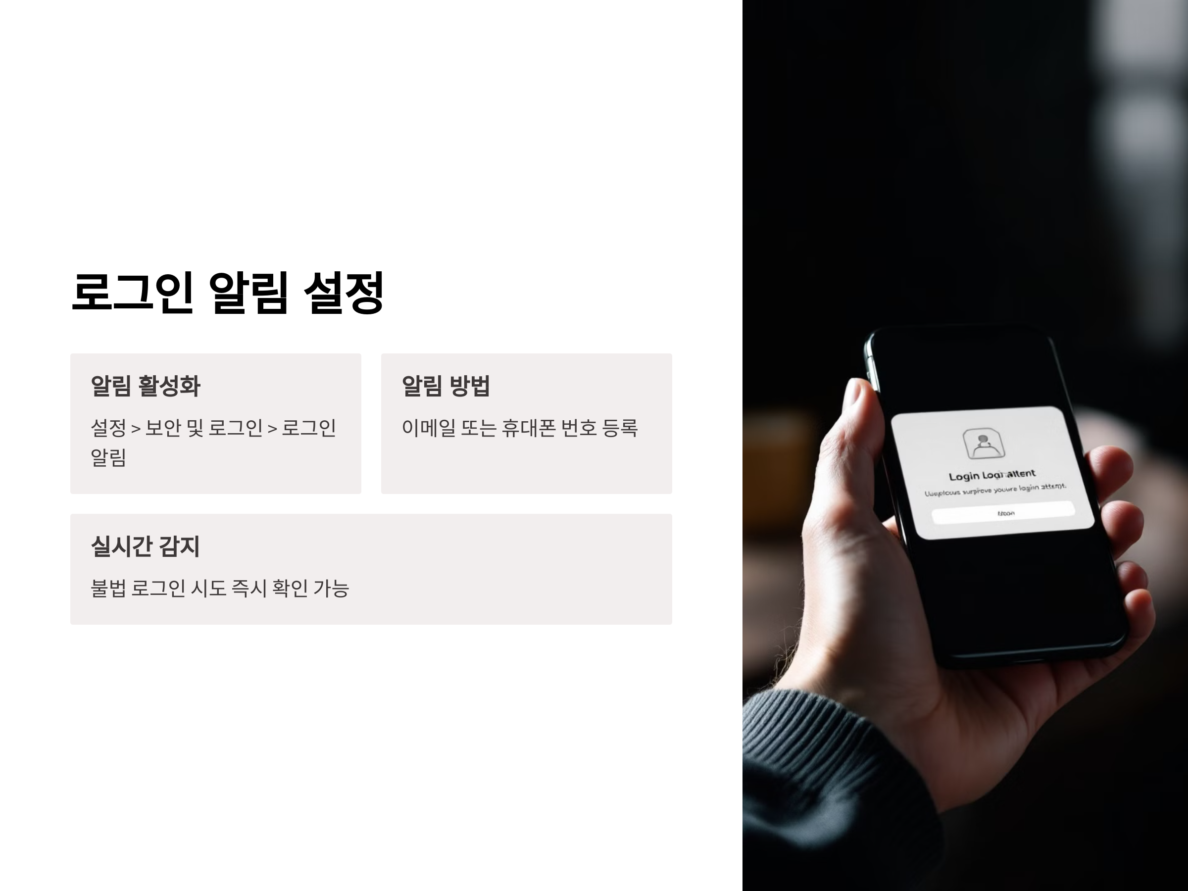 로그인 알림을 설정하면, 내가 모르는 기기나 지역에서 로그인 시도가 발생했을 때 즉시 알림을 받을 수 있어, 빠르게 대응할 수 있습니다.
