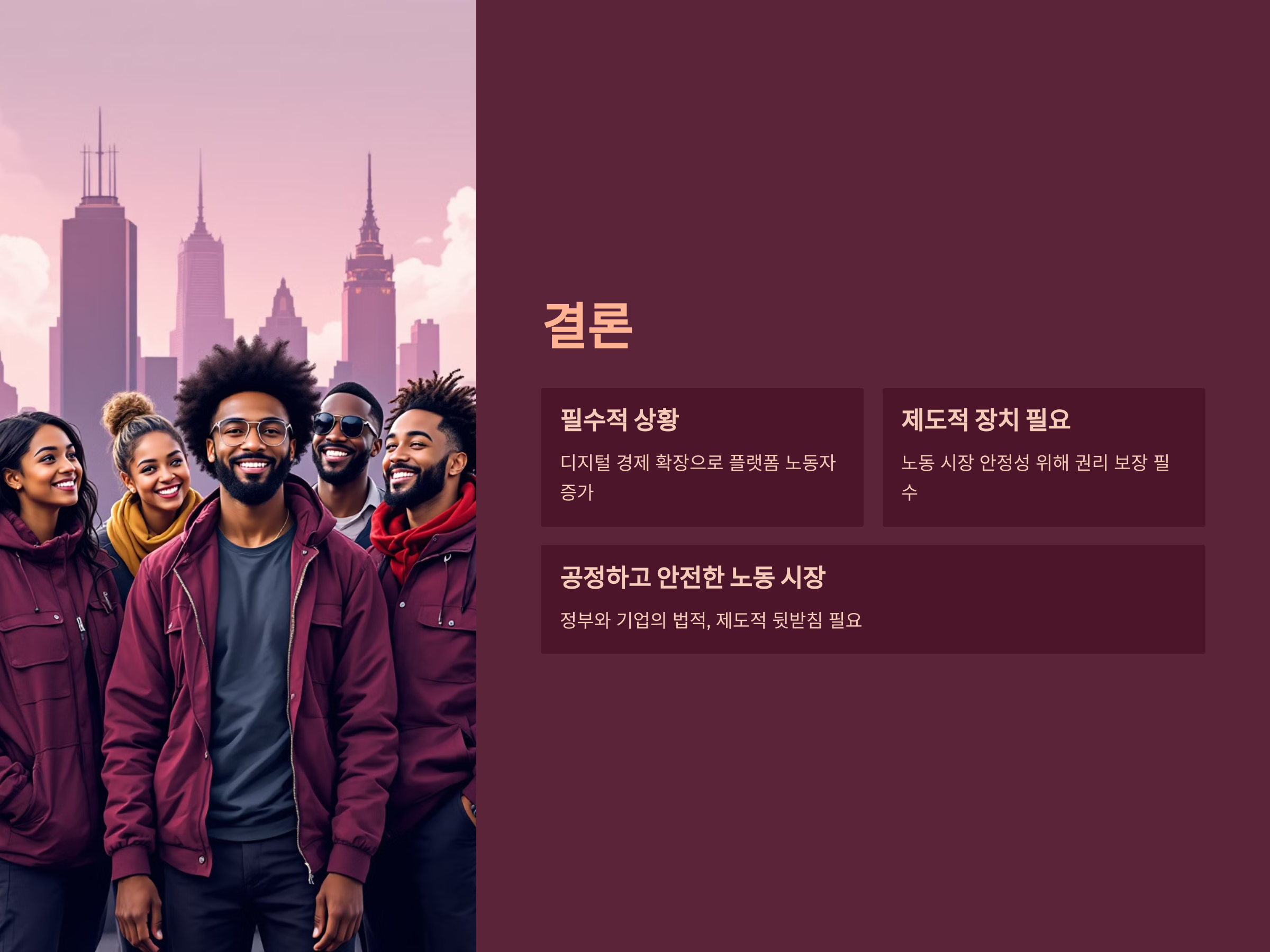 플랫폼 노동자들의 권리 보장을 위한 법적 강화는 이제 선택이 아닌 필수적인 상황입니다. 디지털 경제의 확장에 따라 플랫폼 노동자들의 수는 계속해서 늘어날 것이며, 그들의 권리 보장을 위한 제도적 장치가 마련되지 않는다면 노동 시장의 불안정성은 더욱 커질 수 있습니다. 따라서, 정부와 기업은 플랫폼 노동자들의 권리를 보장할 수 있는 법적, 제도적 뒷받침을 마련하여, 보다 공정하고 안전한 노동 시장을 구축해야 할 때입니다.