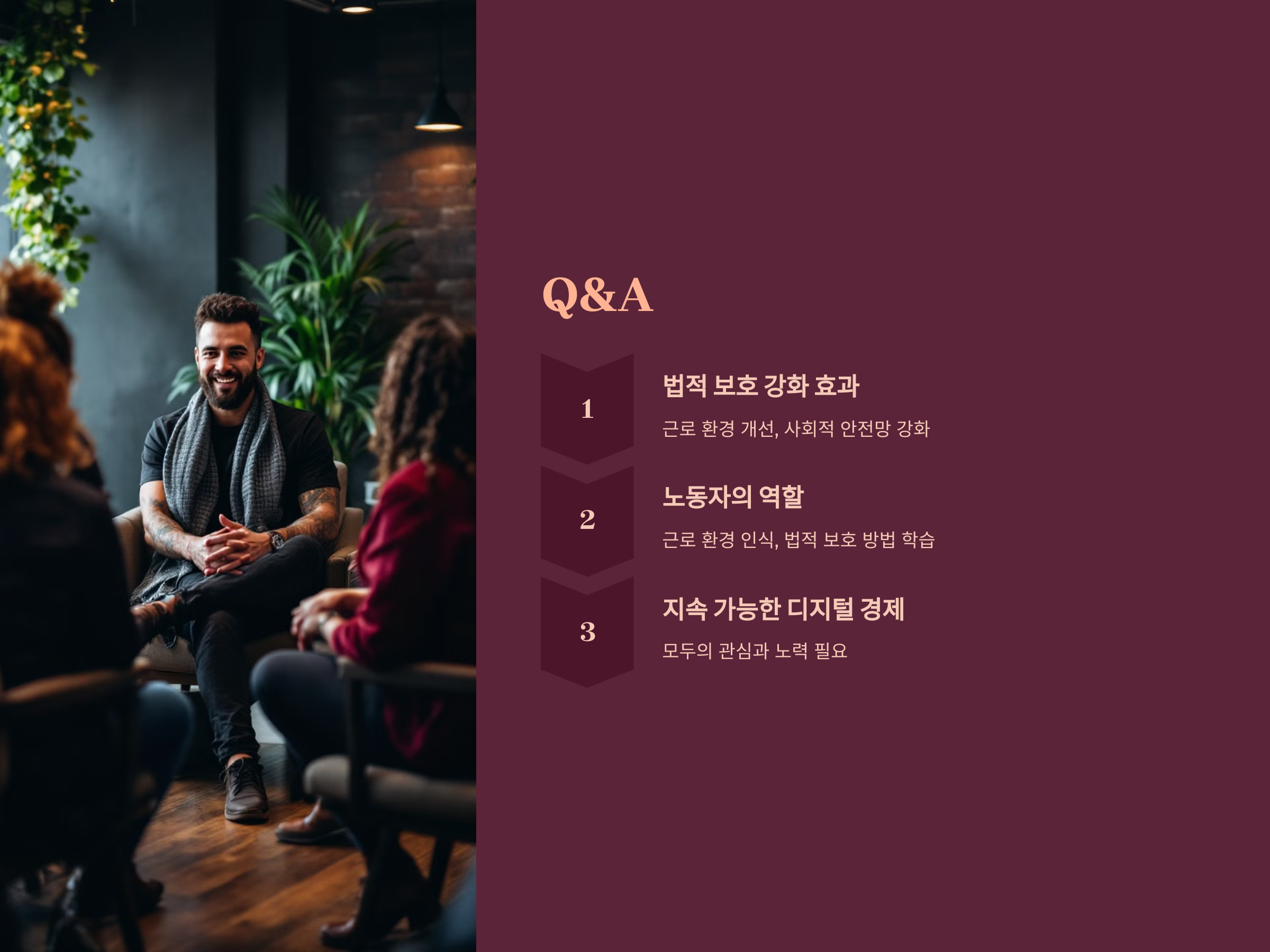 플랫폼 노동자의 권리 보장 강화는 단순히 개별 노동자의 문제가 아니라, 디지털 경제에서의 지속 가능성을 높이는 중요한 일입니다. 앞으로의 법적 변화와 제도적 보완이 이루어질 때, 더 많은 플랫폼 노동자들이 안정적이고 공정한 근로 환경에서 일할 수 있게 될 것입니다. 이러한 변화를 위해서는 모두의 관심과 노력이 필요합니다.