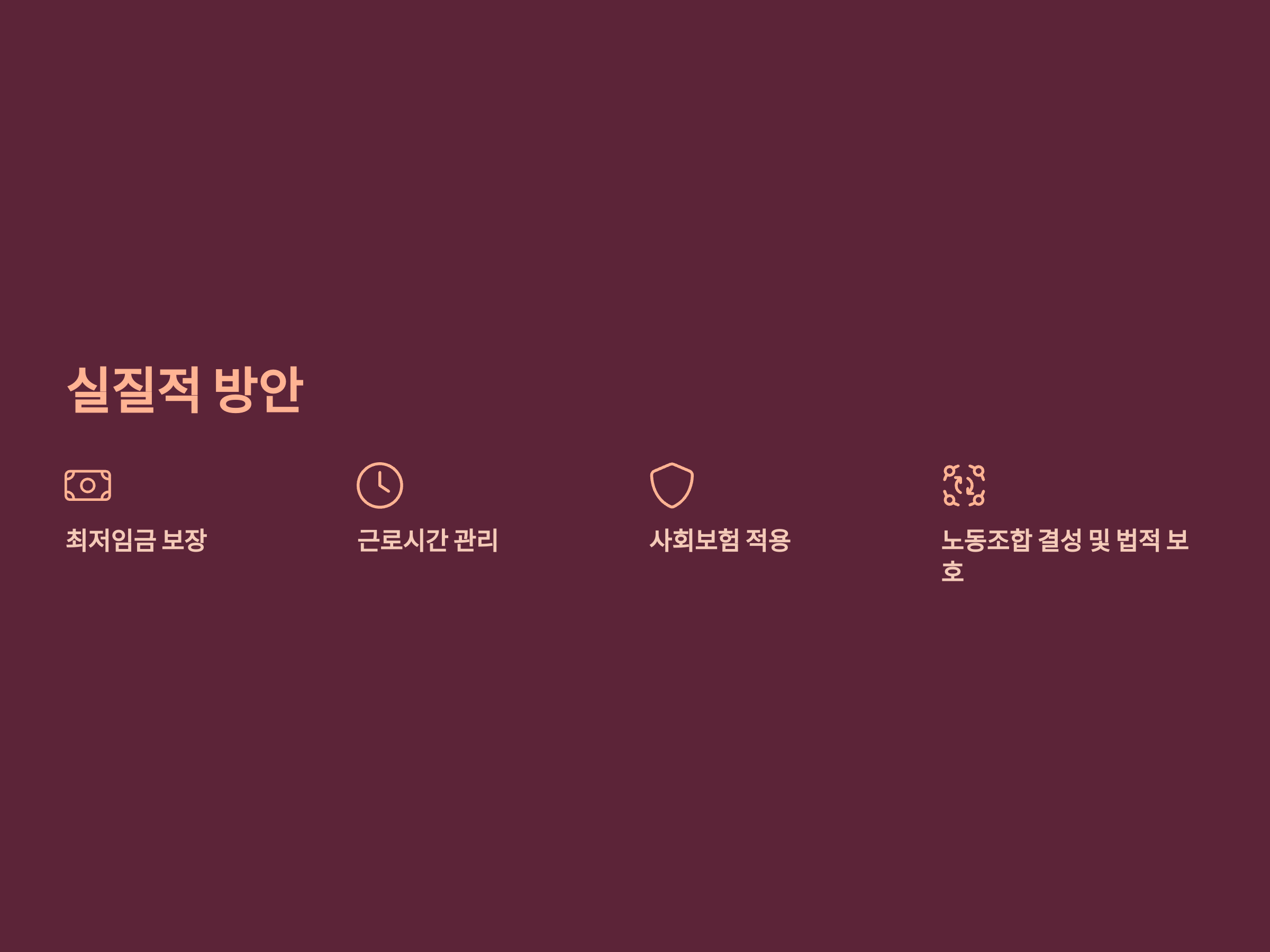 한국에서는 최근 플랫폼 노동자들의 근로 환경을 개선하기 위해 '플랫폼 노동자 보호법' 제정이 논의되고 있으며, 그 핵심 내용은 근로시간 관리, 최저임금 보장, 근로조건의 투명성을 높이는 것입니다. 또한, 고용보험과 산재보험 등의 사회보험 적용 범위를 확대하고, 근로자들의 권리 침해가 발생할 경우 법적 대응을 할 수 있도록 제도적 장치를 마련하는 방향으로 진행되고 있습니다.
