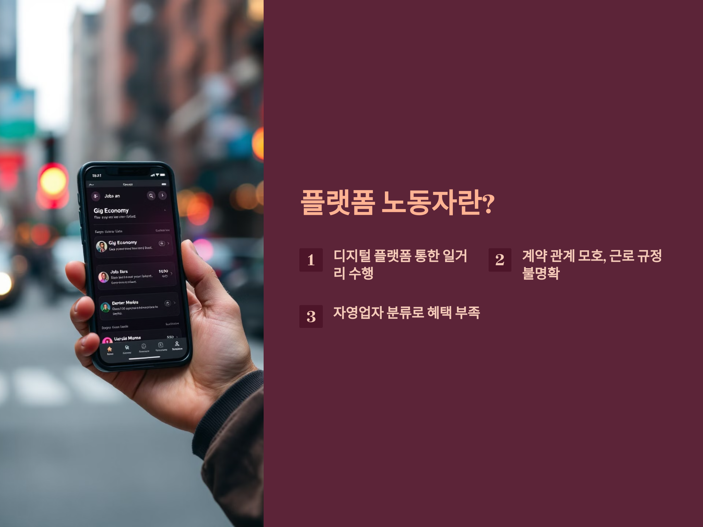 플랫폼 노동은 대개 ‘자영업자’로 분류되기 때문에, 고용보험, 건강보험, 퇴직금 등 전통적인 근로자가 받는 혜택을 누리기 어려운 경우가 많습니다. 그래서 플랫폼 노동자들이 처한 현실은 고용 불안과 낮은 소득, 법적 보호 부족 등 다양한 문제로 이어지고 있습니다.