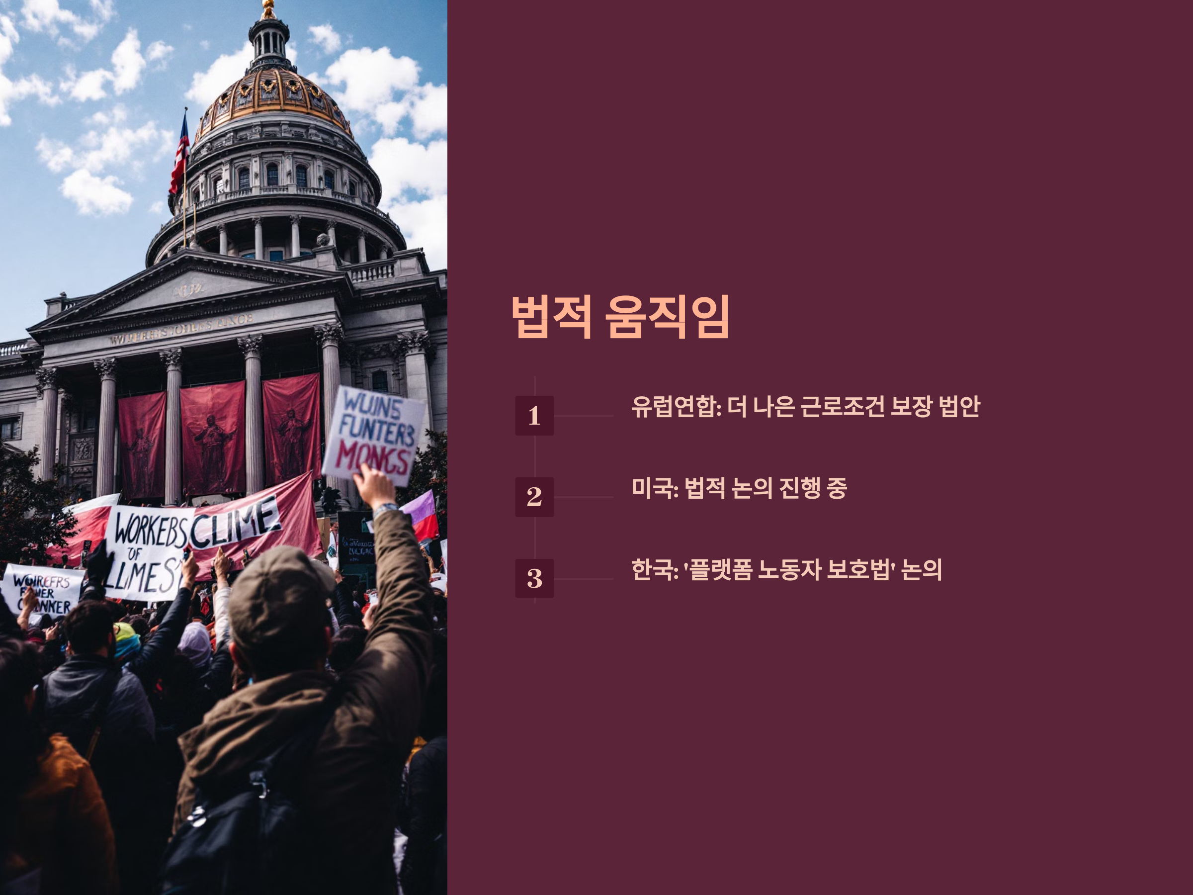 최근 많은 나라에서 플랫폼 노동자들의 권리 보장을 위한 법적 움직임이 일어나고 있습니다. 예를 들어, 유럽연합은 플랫폼 노동자들에게 더 나은 근로조건을 보장하기 위한 법안을 제정하고, 이를 통해 근로자들이 받는 대우를 개선하려는 노력을 기울이고 있습니다. 미국과 한국 등에서도 비슷한 법적 논의가 활발히 진행되고 있습니다.