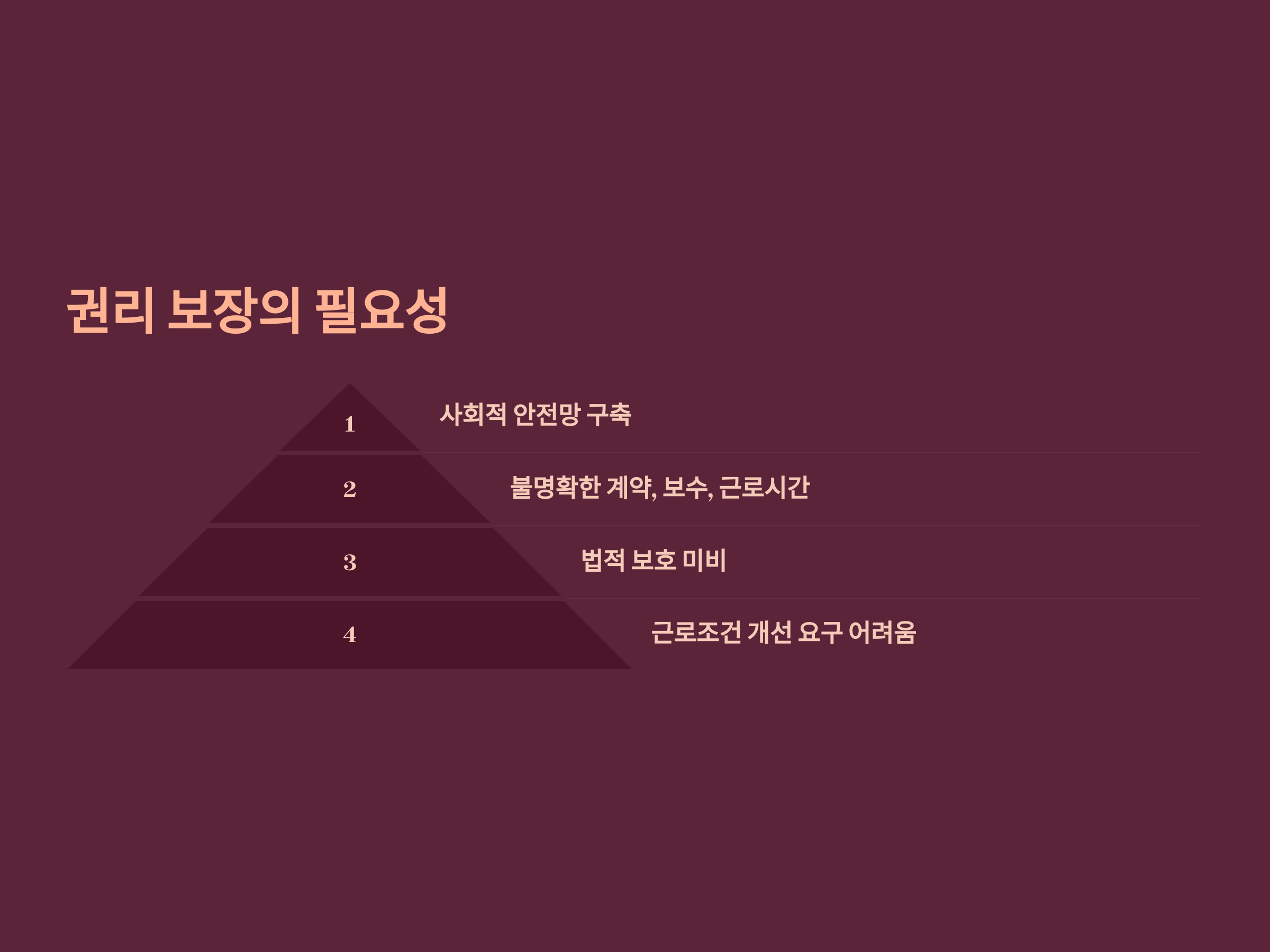 특히 플랫폼 노동자는 고용주의 직접적인 관리와 감독을 받지 않기 때문에 근로 환경에 대한 법적 보호가 미비합니다. 이로 인해 그들은 근로조건 개선이나 보상, 직장 내 안전 등을 요구하기 어려운 구조에 놓여 있습니다. 또한, 일하는 만큼만 수입이 발생하기 때문에 병가나 휴일, 연차 등도 보장받기 어렵고, 안전사고나 질병 발생 시 적절한 보상을 받지 못하는 경우가 많습니다.